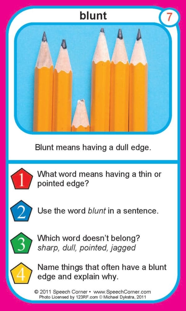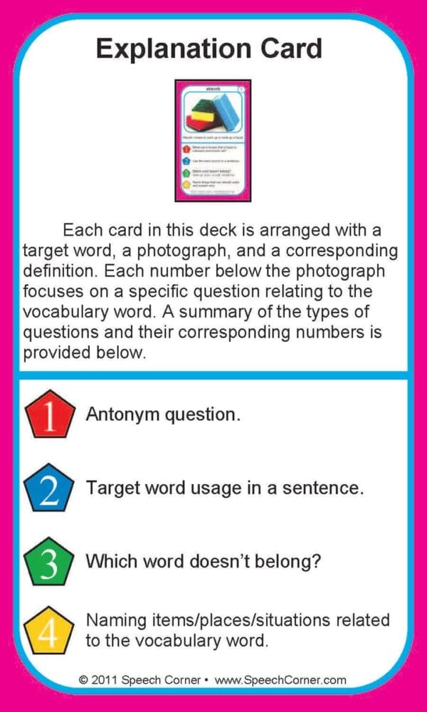 Whether used in therapy sessions, small groups, or independent stations, this deck promotes deep language learning through challenges that target antonyms, sentence usage, categorization, and word associations.