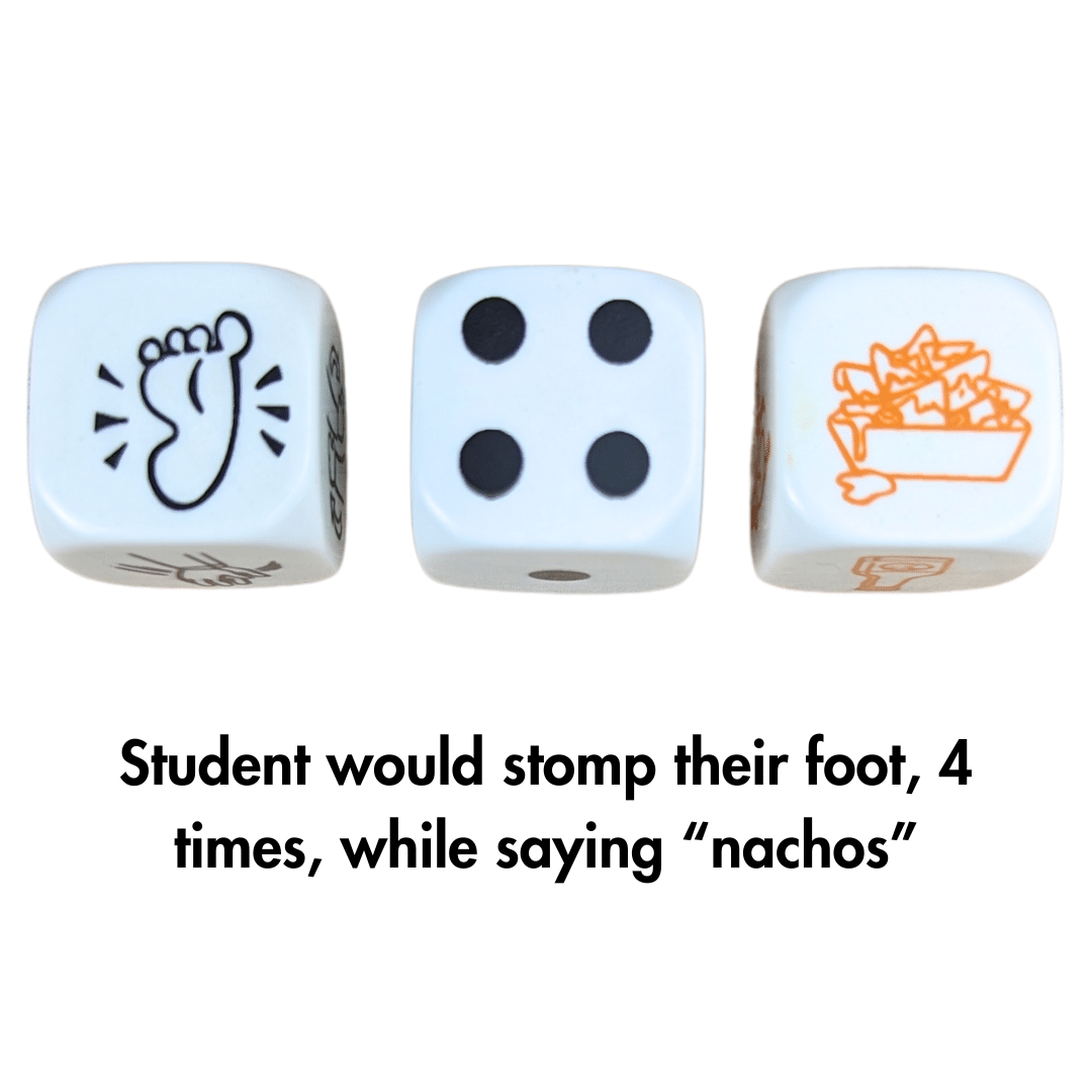 The student says the target word the number of times shown, then repeats it while performing the rolled action!