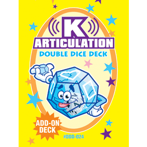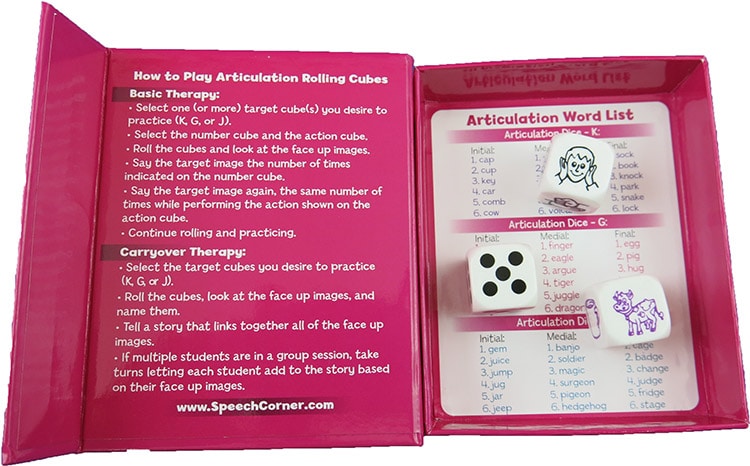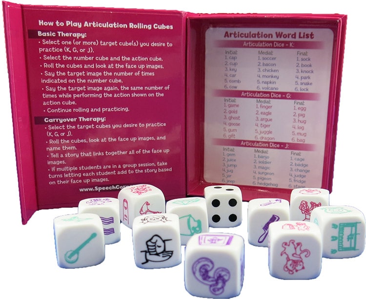 Each cube is designed with colorful target images, actions, or numbers that turn routine articulation drills into a lively game. The SLP selects a target cube (K, G, or J sound) for the student, then adds the action cube and the number cube. The student rolls all three cubes into the storage box, revealing a unique practice combination. They then say the target word the number of times shown on the number cube while performing the action on the action cube—for example: “Say ‘key’ five times while clapping your hands.”