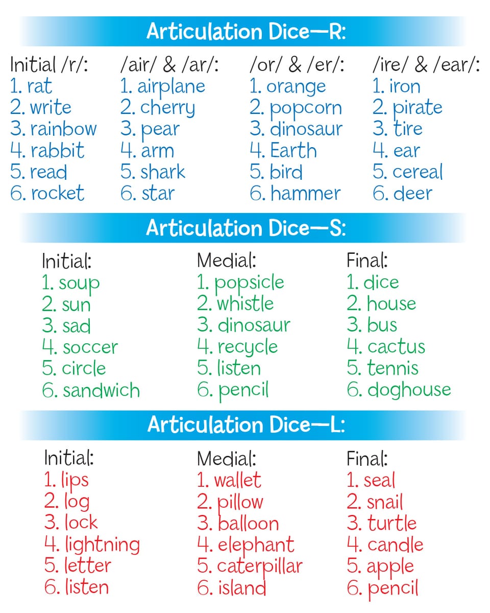 Articulation Rolling Cubes R/S/L helps your students roll into articulation therapy! This unique articulation therapy resource features 10 therapy articulation cubes that illustrate 60 target images, 1 number cube, and 1 action cube. Roll them solo or in combination to practice isolated words numerous times, with corresponding actions, or while making up stories for carryover practice.