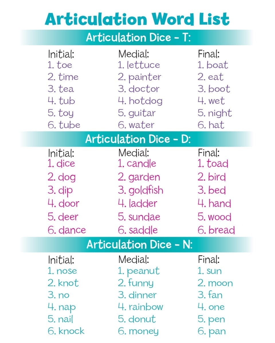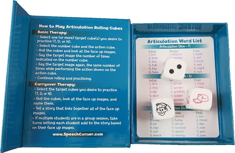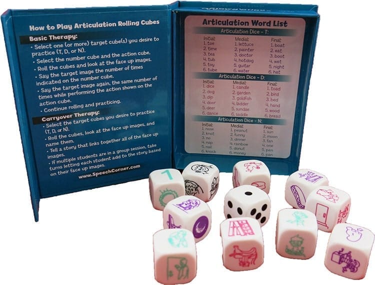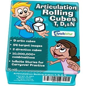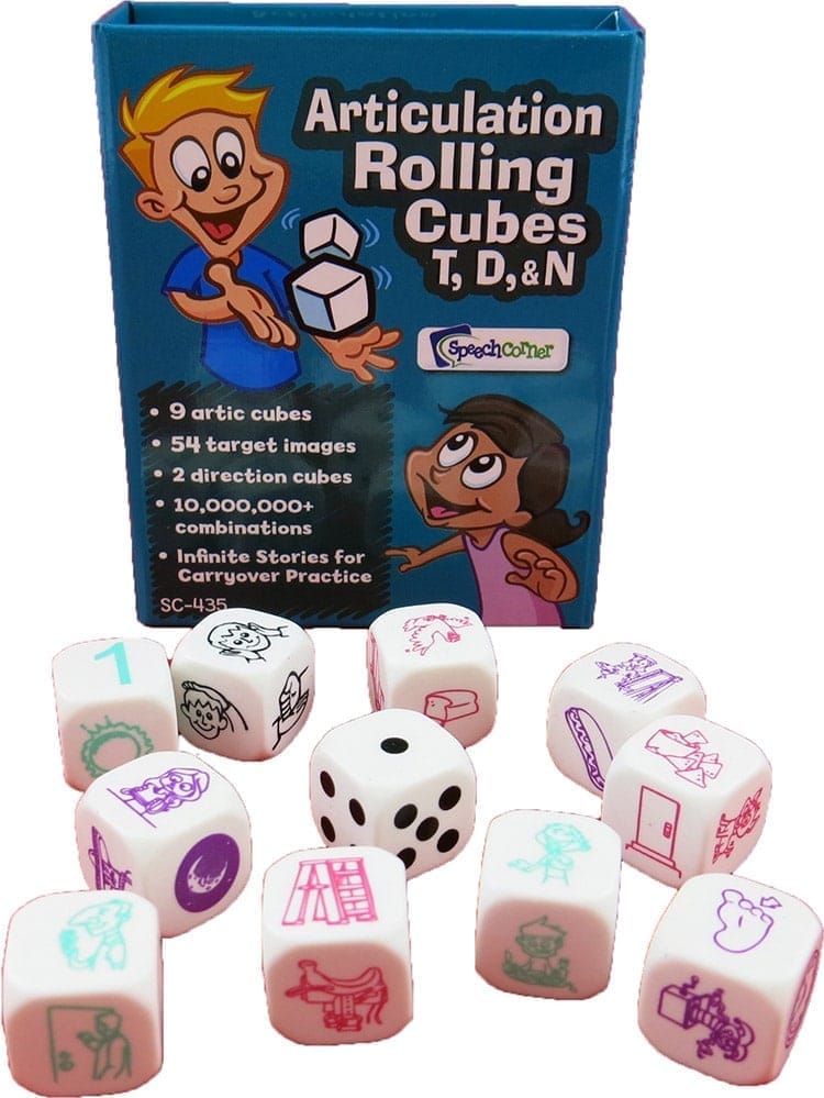 Articulation Rolling Cubes T/D/N helps your students roll into articulation therapy! This unique articulation therapy resource features 9 therapy articulation cubes that illustrate 54 target images, 1 number cube, and 1 action cube. Roll them solo or in combination to practice isolated words numerous times, with corresponding actions, or while making up stories for carryover practice.