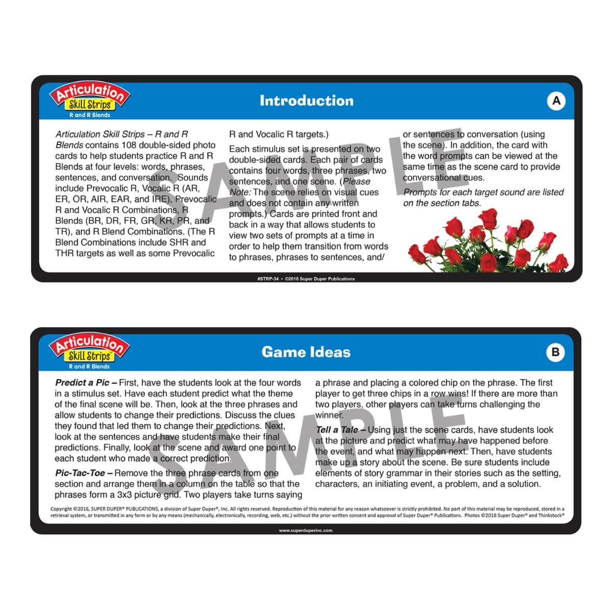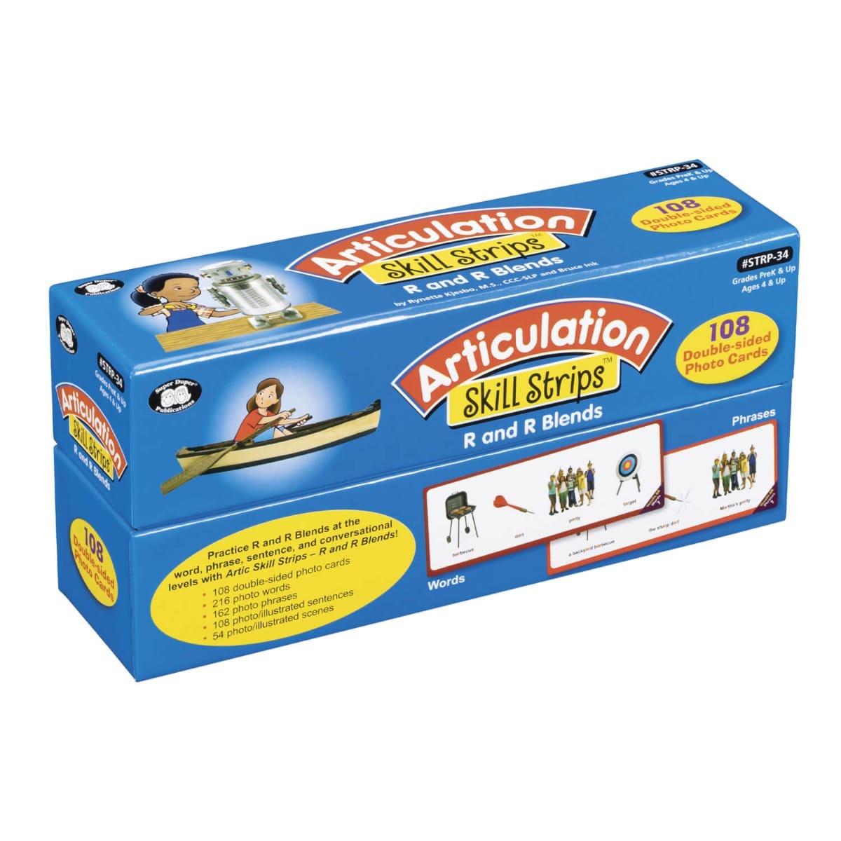 Help students master /r/ and /r/ Blends with the Articulation Skill Strips, a comprehensive set of 108 double-sided photo/illustrated cards. Designed for progressive practice, these strips target /r/ sounds at four levels: words, phrases, sentences, and conversation, making it an ideal tool for speech therapy sessions.