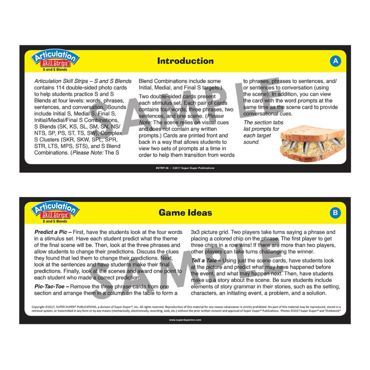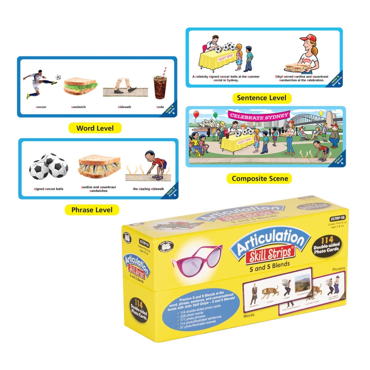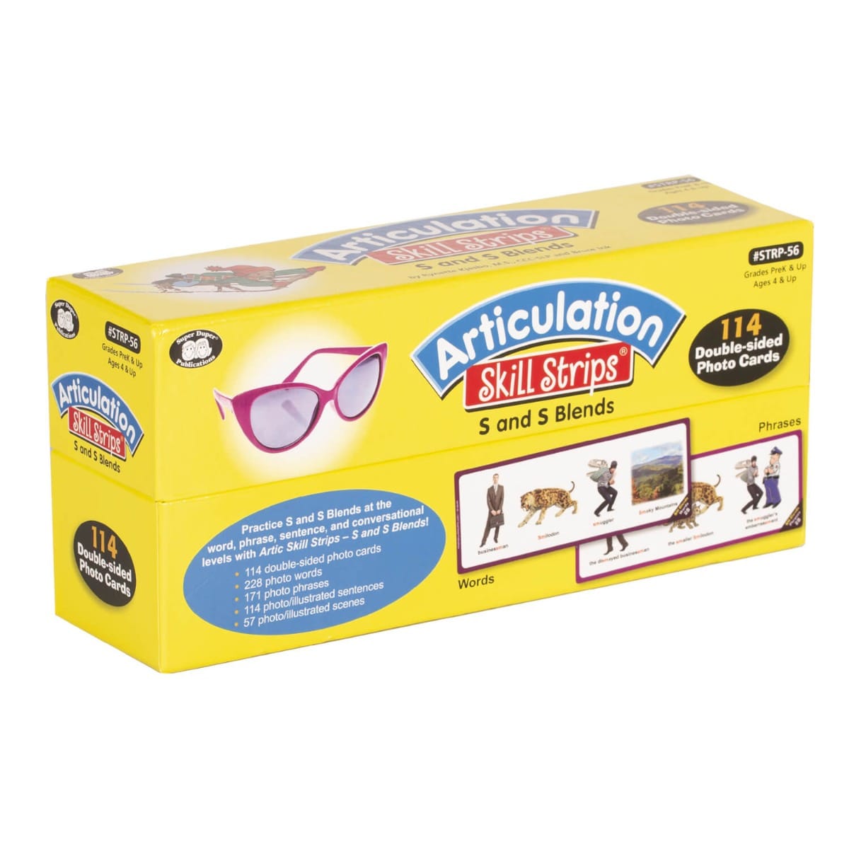 Master /s/ and /s/ Blends with the Articulation Skill Strips, a set of 114 double-sided photo/illustrated cards designed to target /s/ sounds at four levels: words, phrases, sentences, and conversation. These skill strips provide progressive practice, ensuring students improve their articulation skills while staying engaged with fun and humorous scenes.