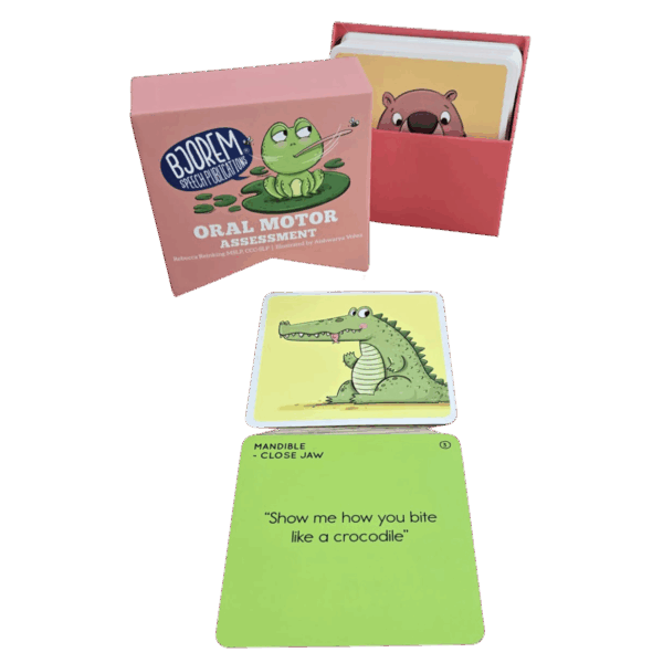 The Bjorem Oral Motor Assessment Cards are an innovative, must-have tool for Speech-Language Pathologists. Designed with children in mind, these visually engaging cards simplify oral mechanism exams by pairing playful illustrations with clear, kid-friendly instructions.