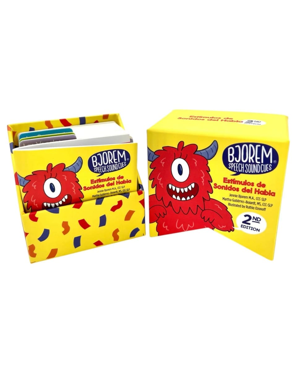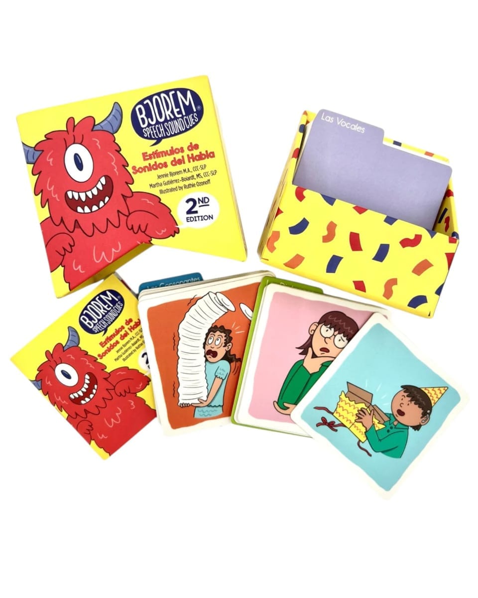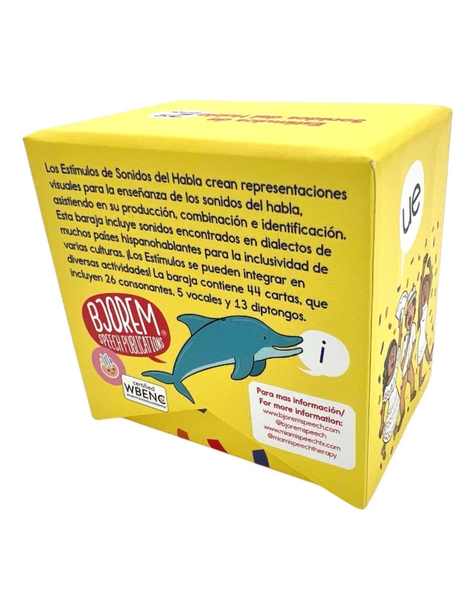 Con 44 tarjetas que cubren consonantes, vocales y diptongos, esta colección es una herramienta esencial para terapeutas del habla, educadores y profesionales de la comunicación que trabajan con estudiantes bilingües o hispanohablantes.