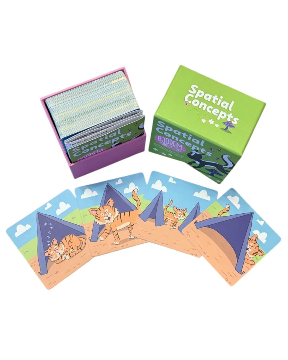 ✔️ Bjorem Speech® Spatial Concepts Deck — 62 full-color 3″ x 3″ illustrated cards with language prompts on the back
