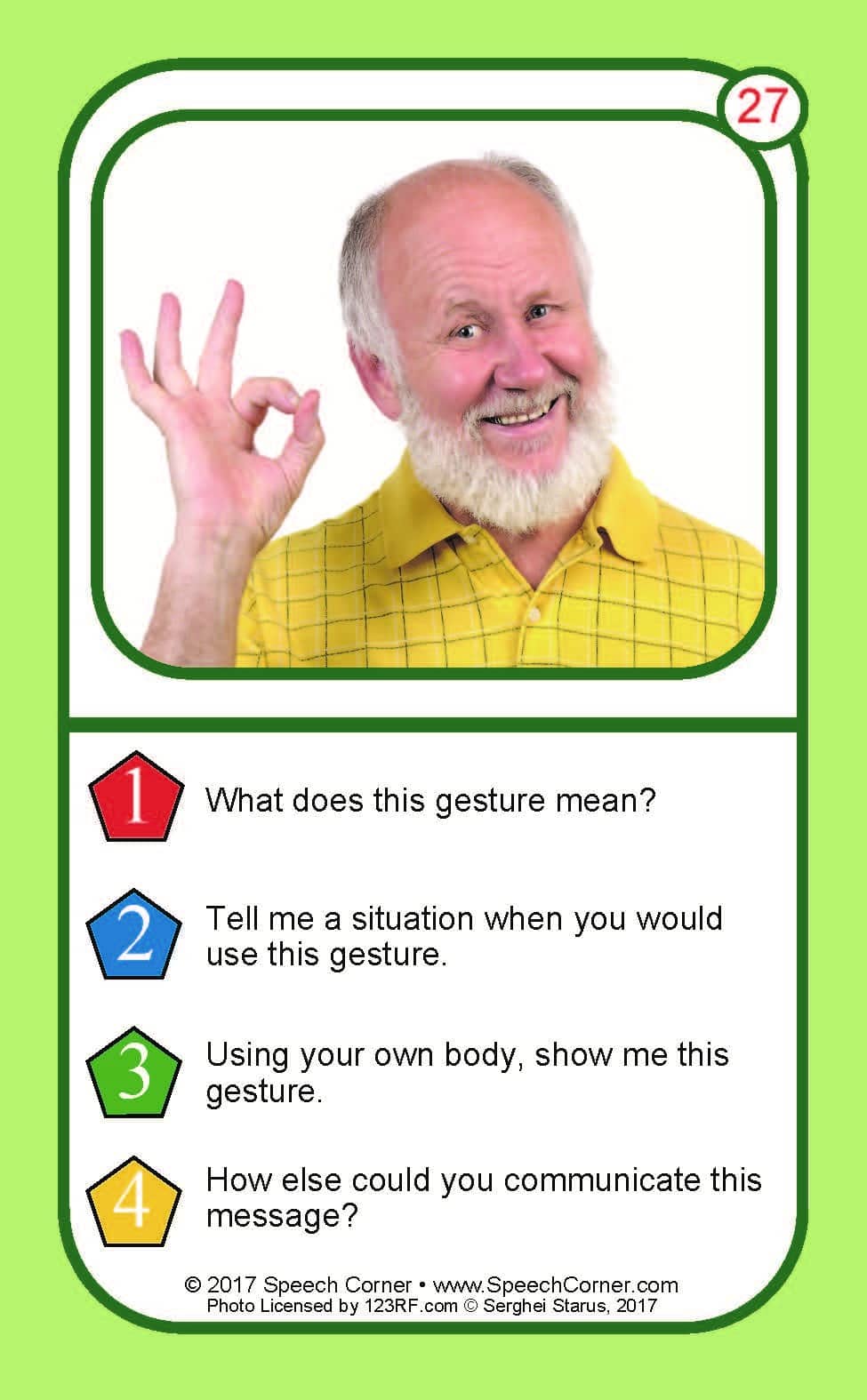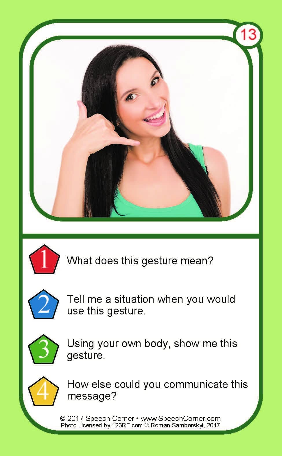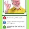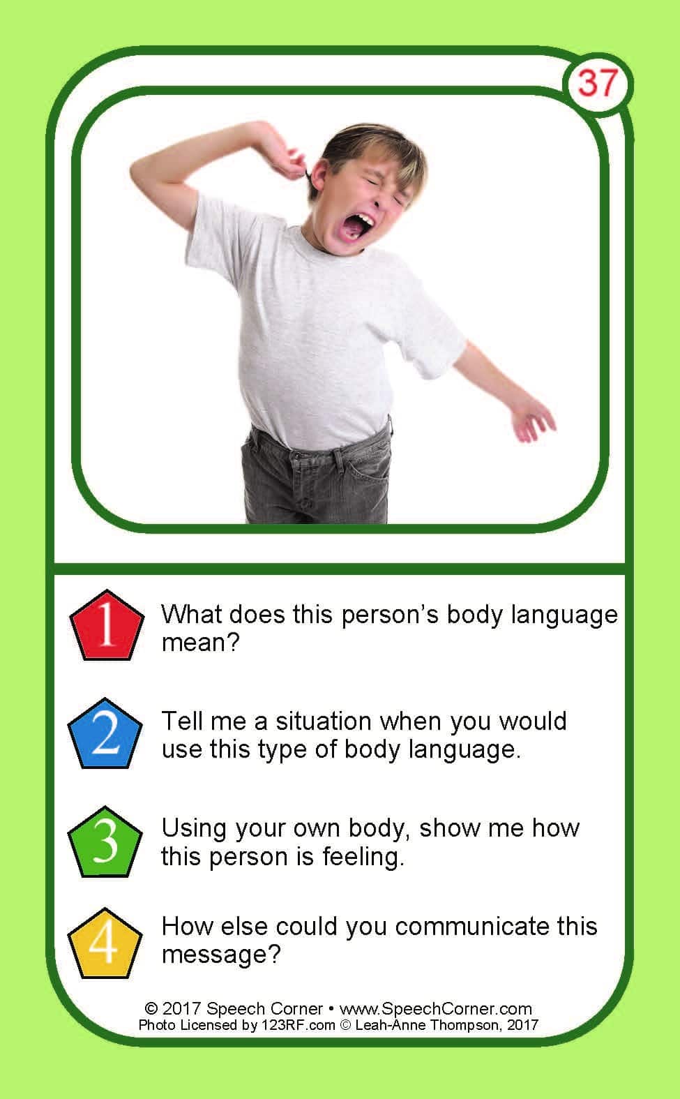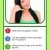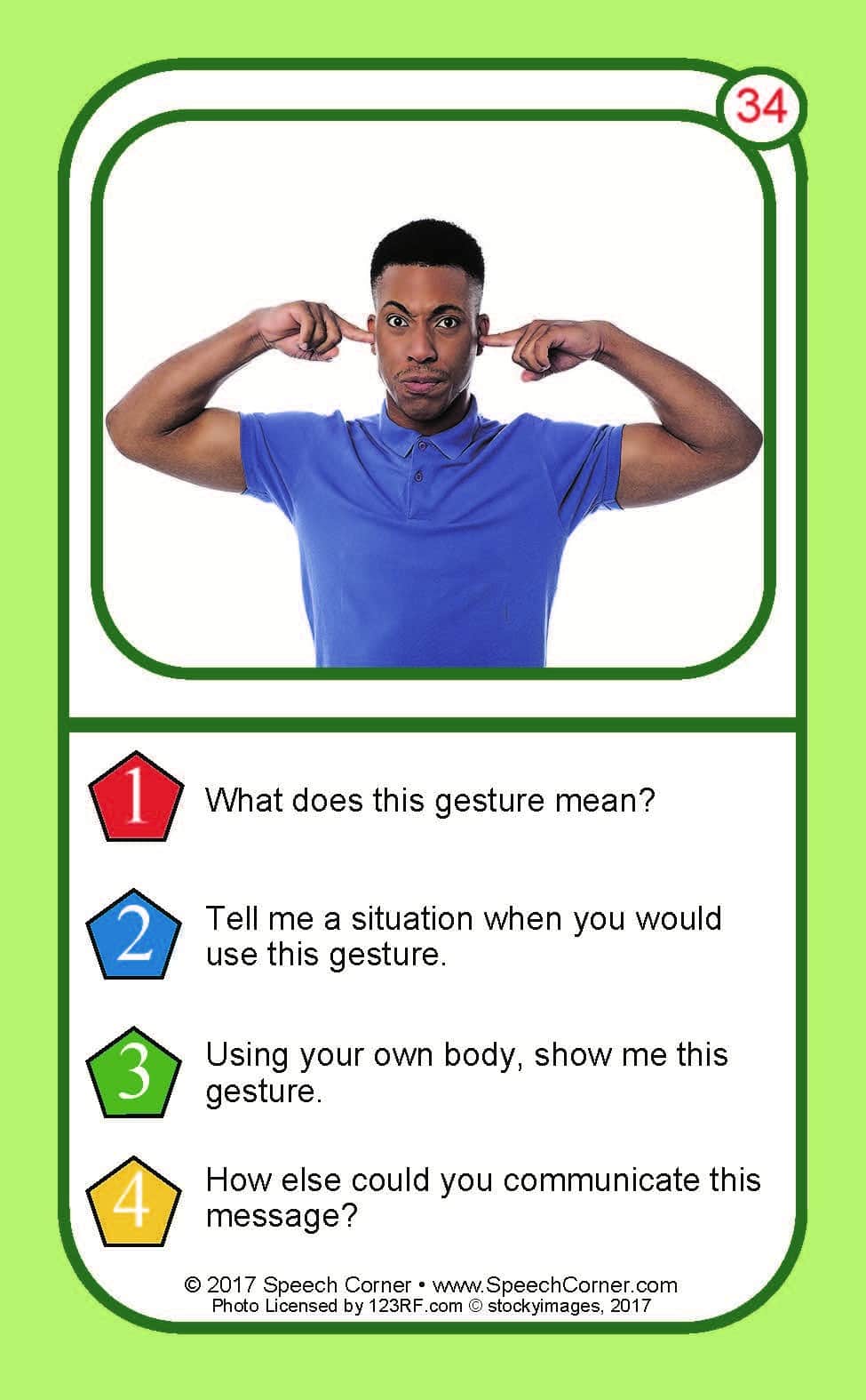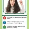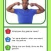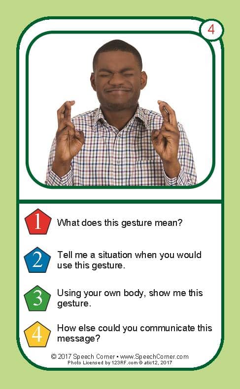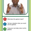 Each card features a high-quality photograph of individuals using gestures or body language, paired with follow-up questions that guide students to interpret intent, explain meaning, and demonstrate understanding.