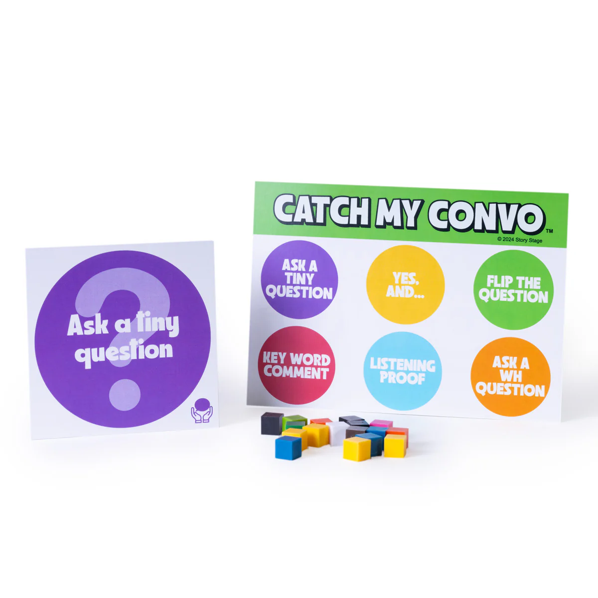 CONTENTS: 10 game boards, 6 Convo Catch strategy cards, 6 Convo Pitch topic cards, 6 Mini Posters for teaching strategies, 1 Digital timer (battery not included), 70 colored stacking cubes, Game bag