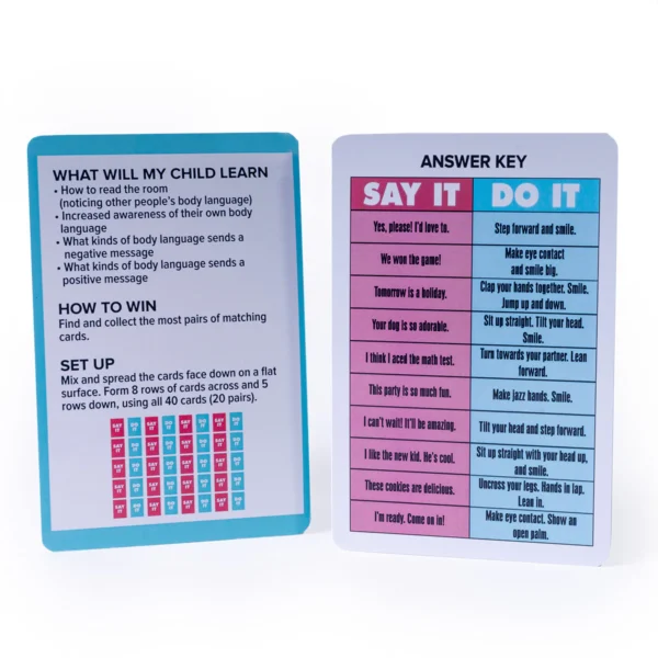 Body Language Match-Up is an easy-to-play game that sparks natural conversations about how nonverbal cues impact communication. Research shows that when body language doesn’t match words, listeners pay more attention to body language—making this game a powerful way to build awareness and skills.