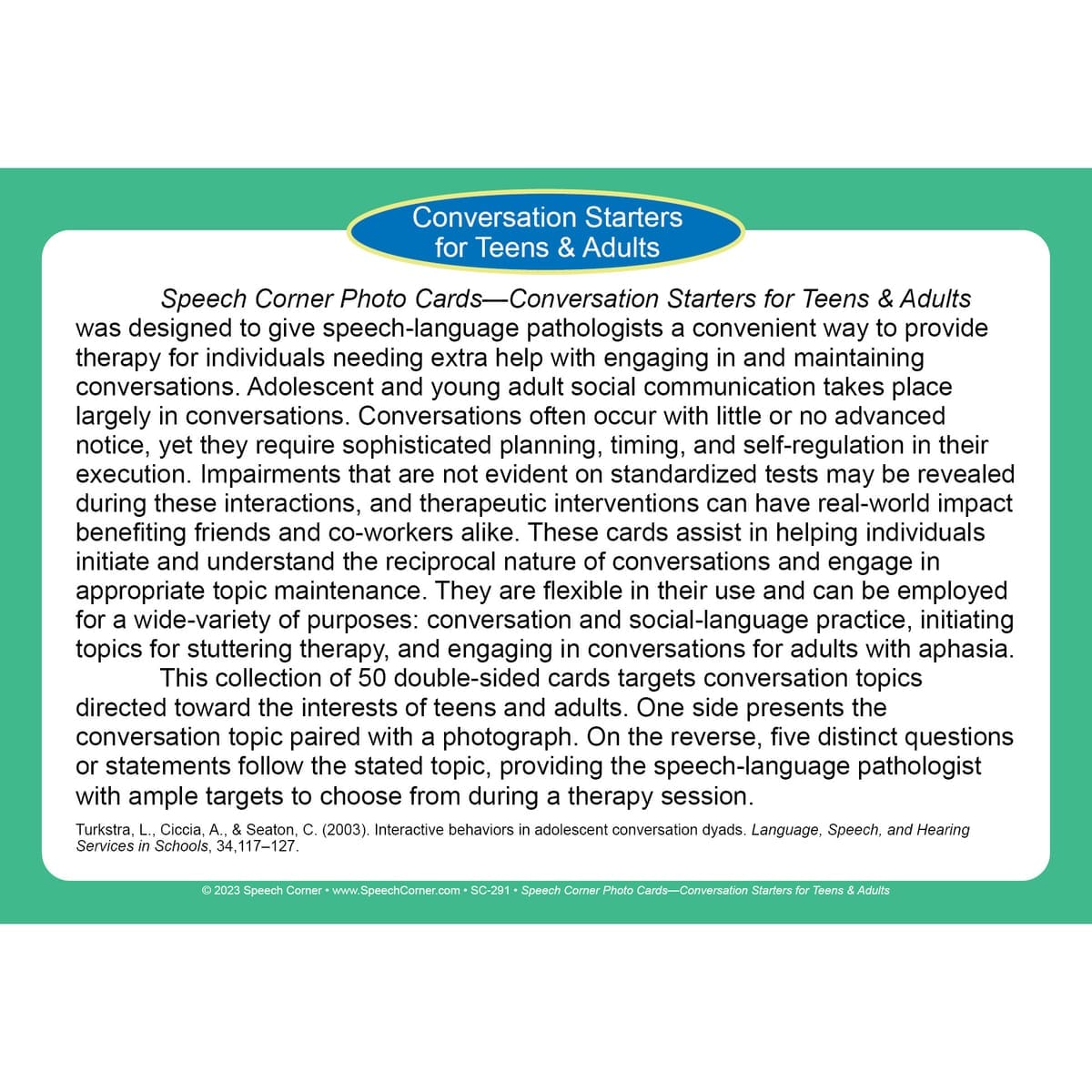Speech Corner Photo Cards – Conversation Starters for Teens and Adults are a versatile tool designed to spark real dialogue and build essential communication skills. Each card features a thought-provoking photo paired with an open-ended prompt—ideal for encouraging spontaneous language in a wide range of clinical settings.