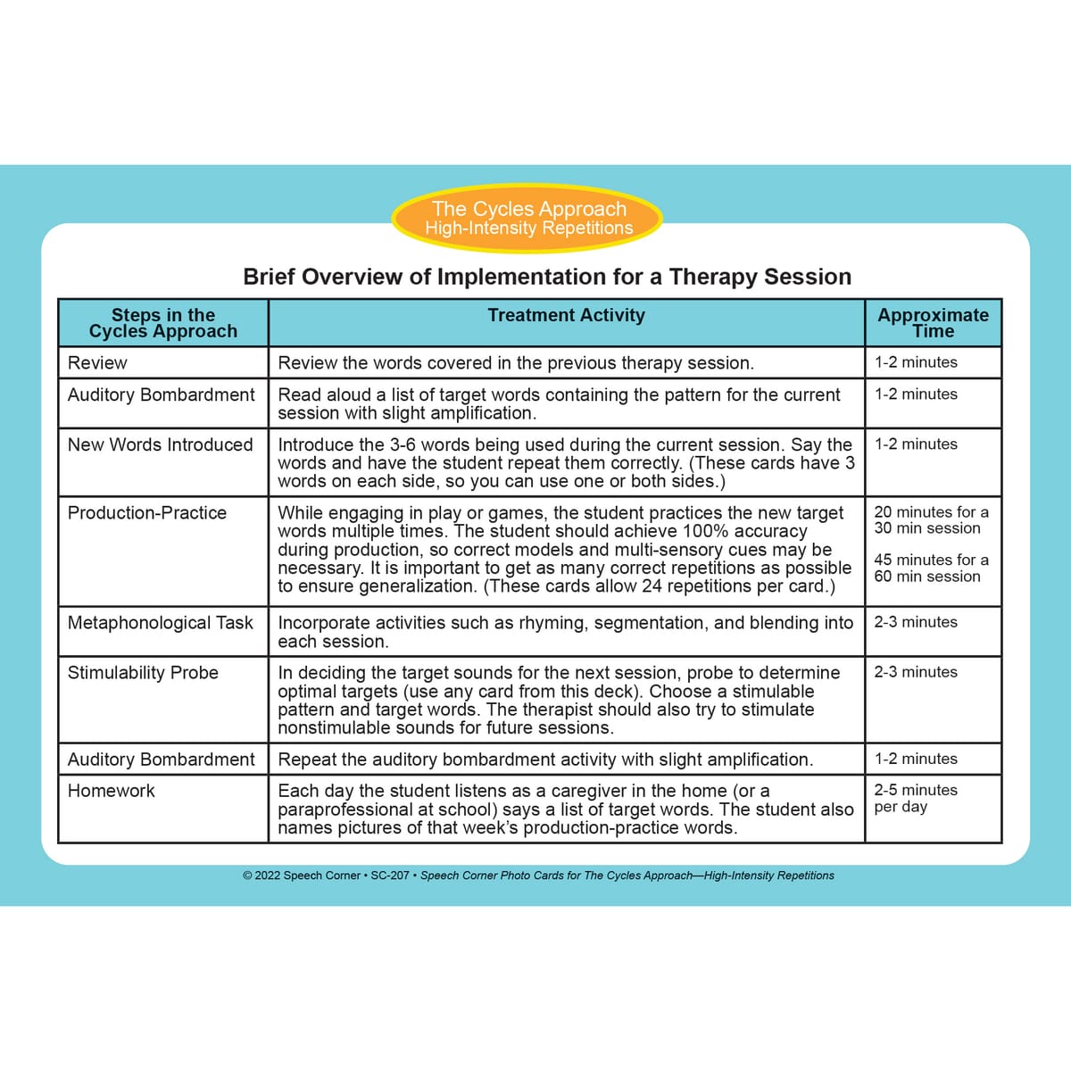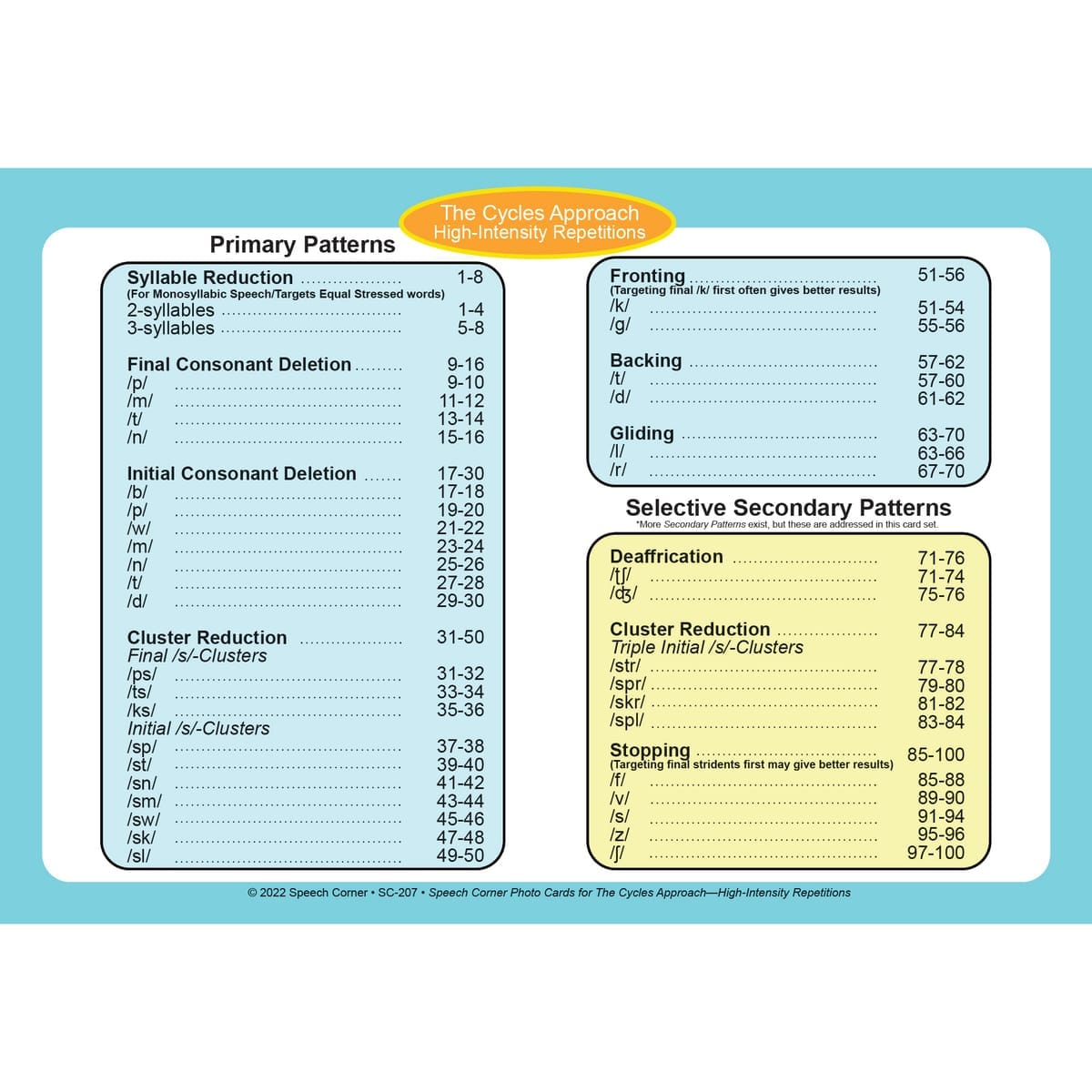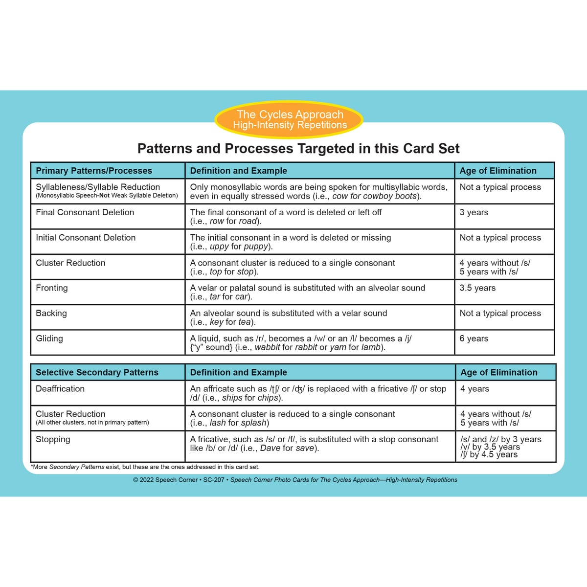- Quick Reference Cards: Summarize the Cycles Approach, provide an overview of phonological processes, their typical elimination ages, and whether they are primary or secondary patterns.