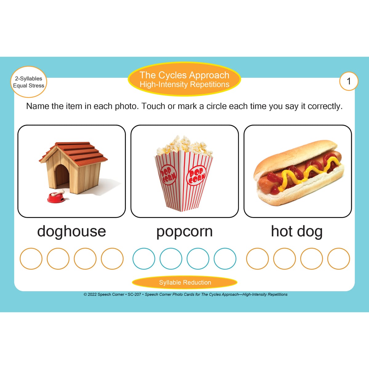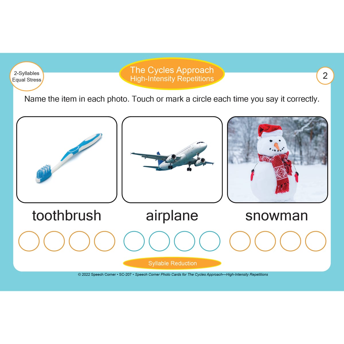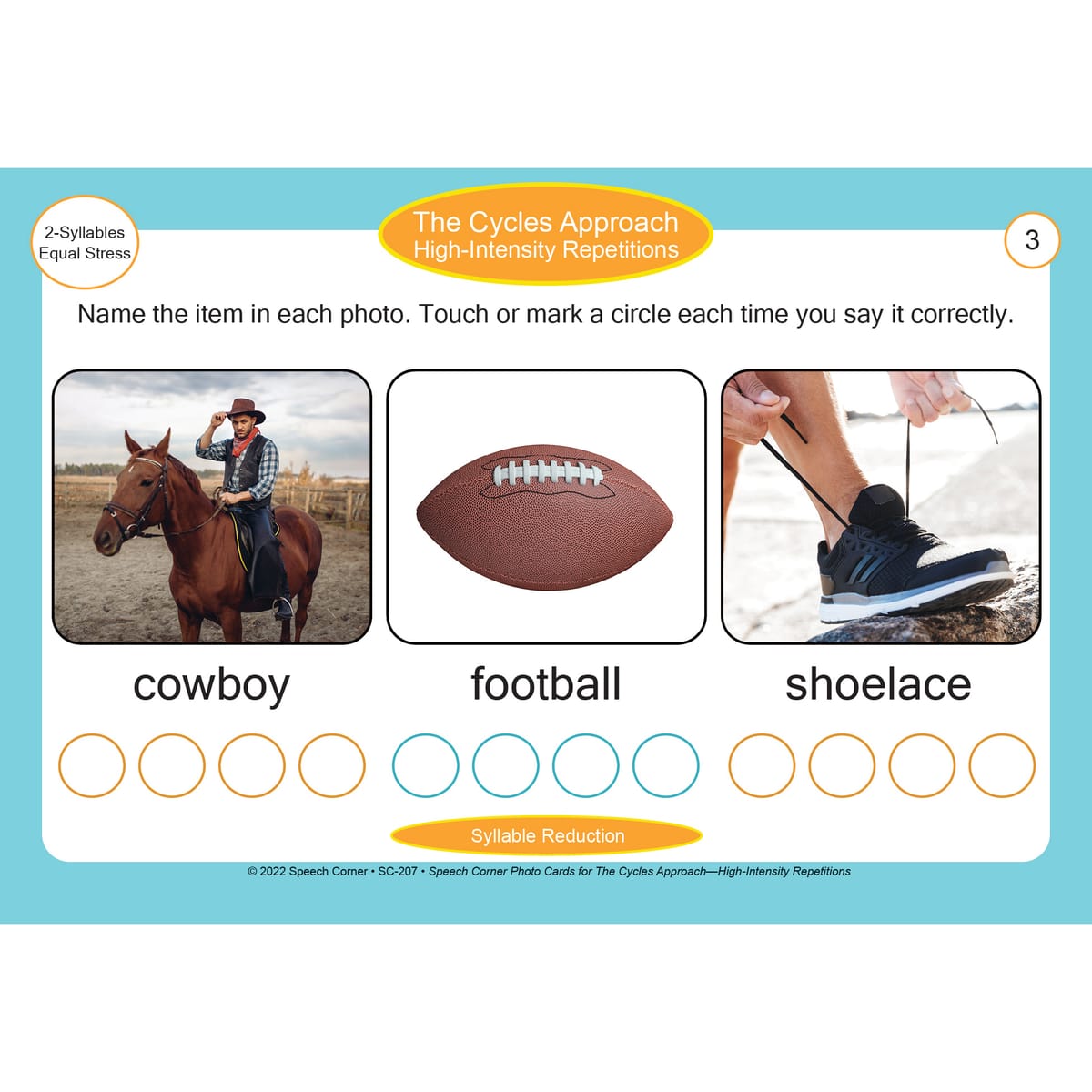 This set of 50 double-sided cards is designed to maximize speech practice efficiency, featuring three photographs with four repetitions per side, allowing for a total of 24 repetitions per card. If a student completes one card four times during a therapy session, they can achieve approximately 100 trials per session.