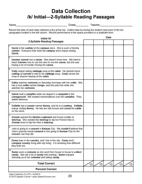 - Data sheets featuring pictures, single words, phrases, sentences, and sound-loaded paragraphs.