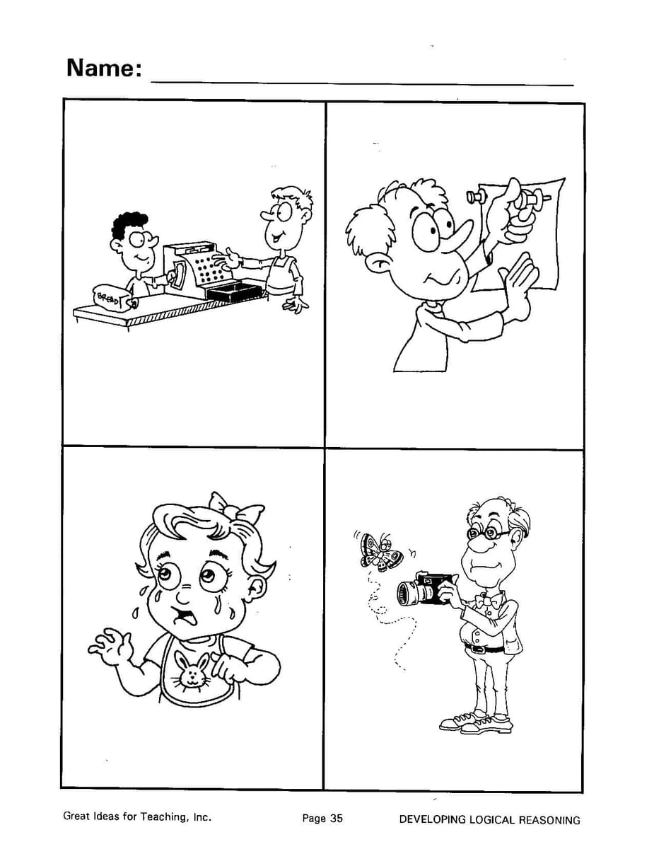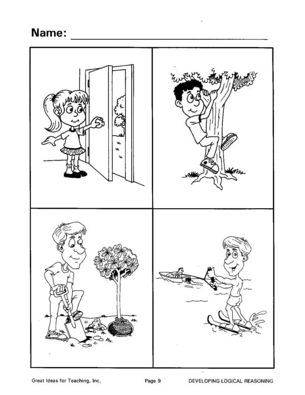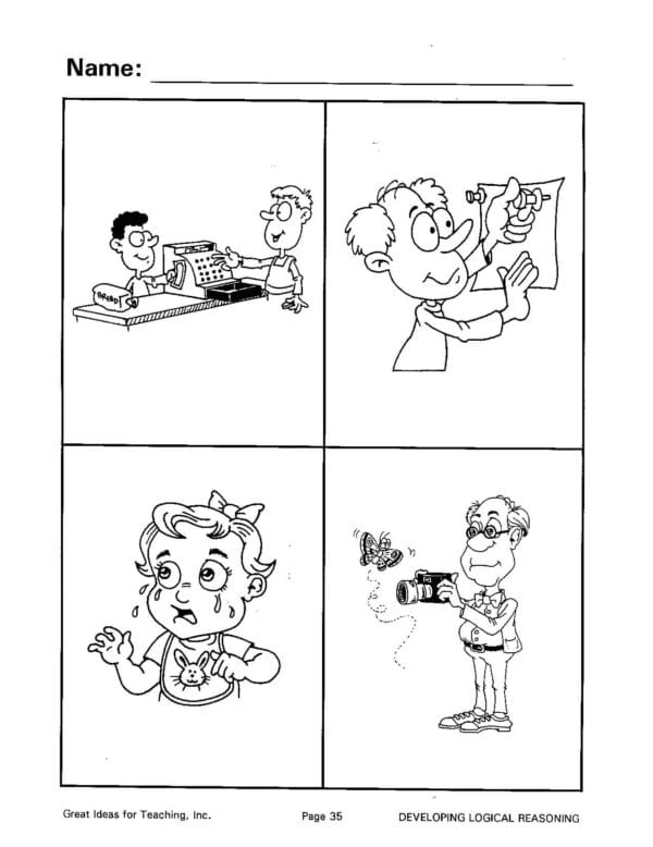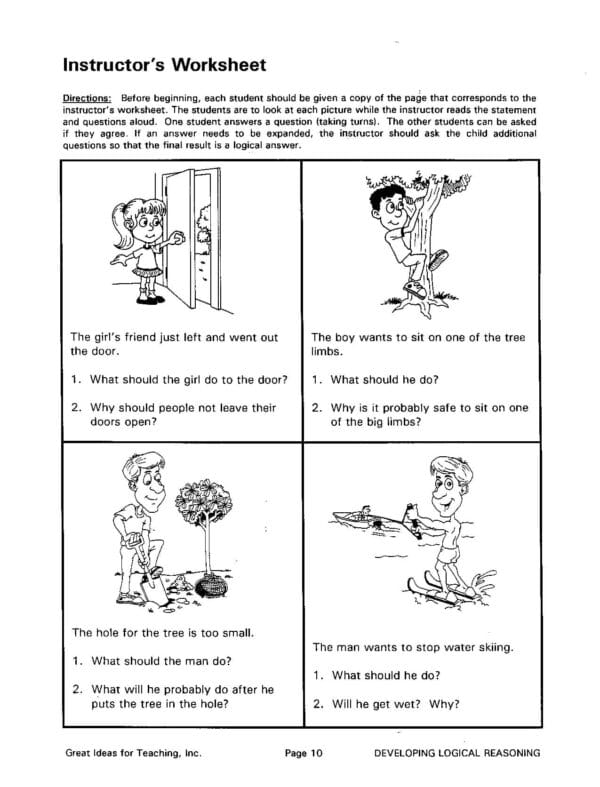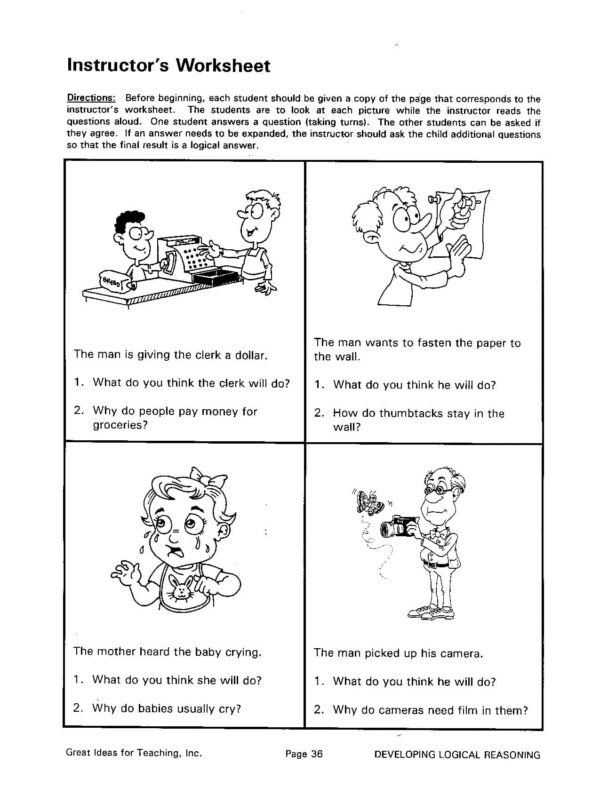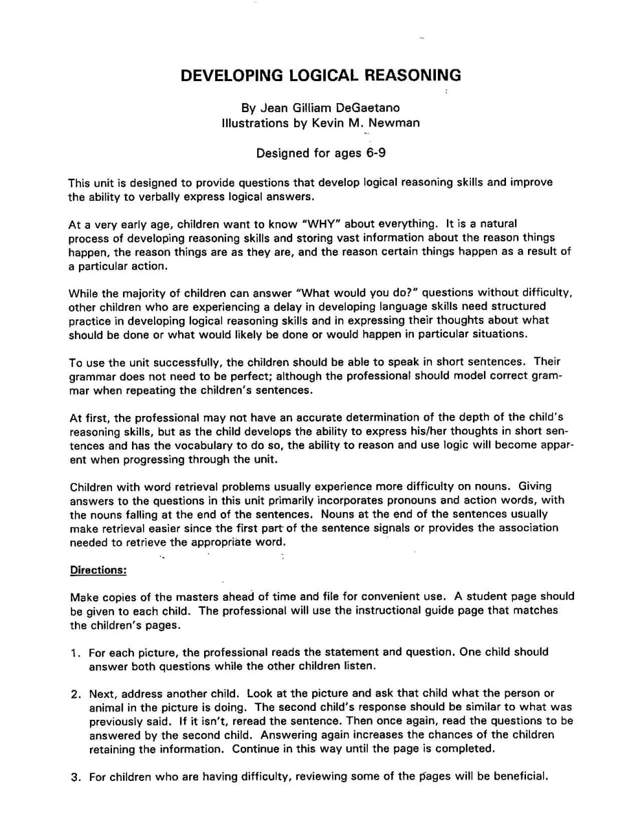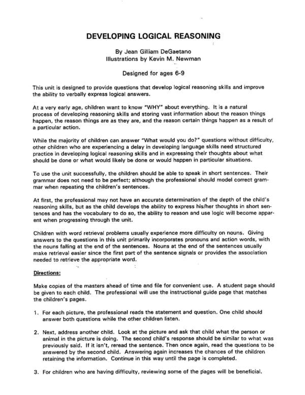 This unit is designed to provide questions that develop logical reasoning skills and improve the ability to verbally express logical answers. Clear illustrations, with all the questions provided, will help develop the students’ ability to consistently give logical answers. This book is a little more difficult than the workbook, Verbal Reasoning Activities (GI-185). To use this unit successfully, students should be able to speak in short sentences.