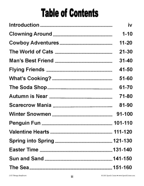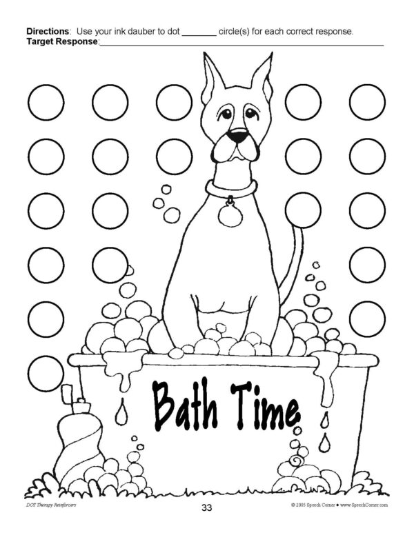 These open-ended reproducible worksheets are the perfect way for you to target any skill you desire in a motivating format. Upon answering a question, articulating a specific sound/word/sentence, illustrating a concept, or demonstrating any specific target response the students have the opportunity to mark up their game sheet using paint markers (bingo-type markers). When the game sheet is completed and all the circles are filled in, the paint marker activity and the student’s work on that specific target response are finished. The clinician is able to modify the length of the activity by dictating how many circles get “dotted” per correct response. DOT Therapy Reinforcers includes: