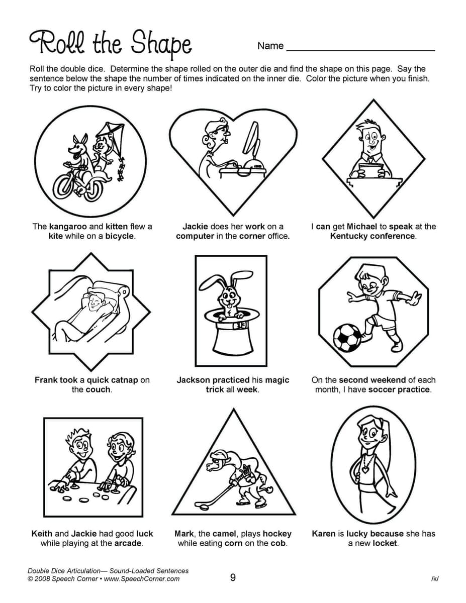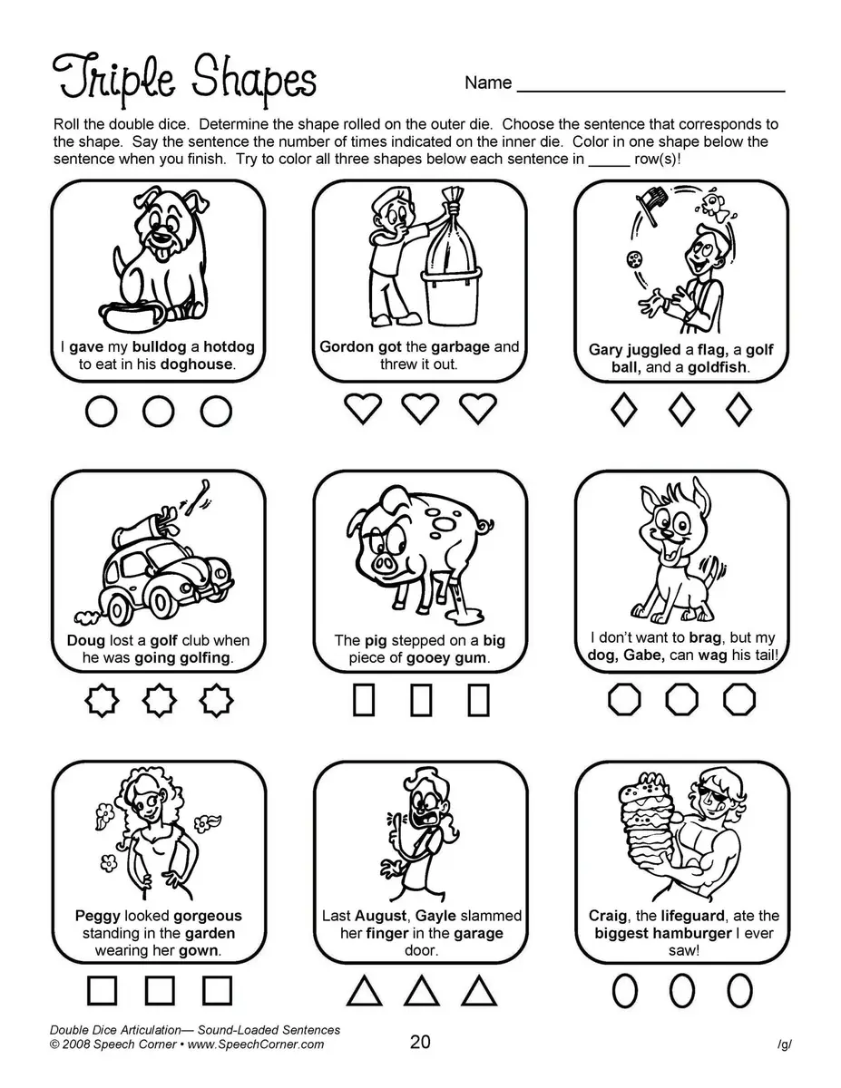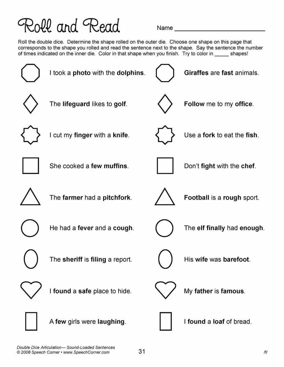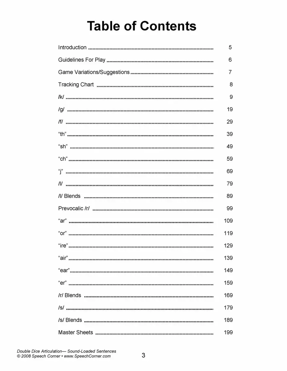 - Reproducible worksheets for /k/, /g/, /f/, “th,” “sh,” “ch,” “j,” /l/, /l/ blends, prevocalic /r/, “ar,” “or,” “ire,” “air,” “ear,” “er,” /r/ blends, /s/, and /s/ blends, all in sound-loaded sentences.