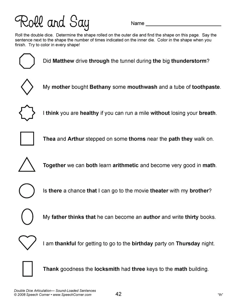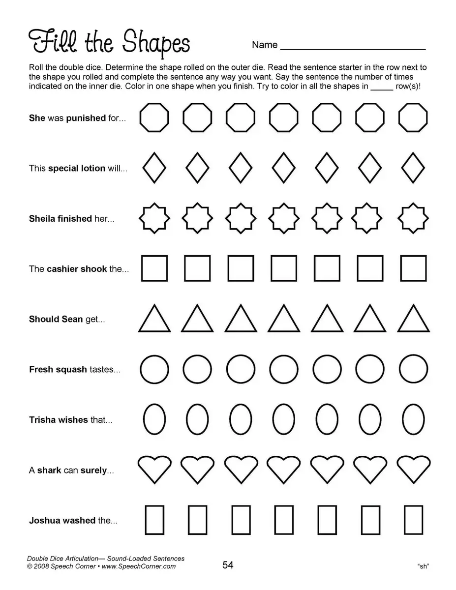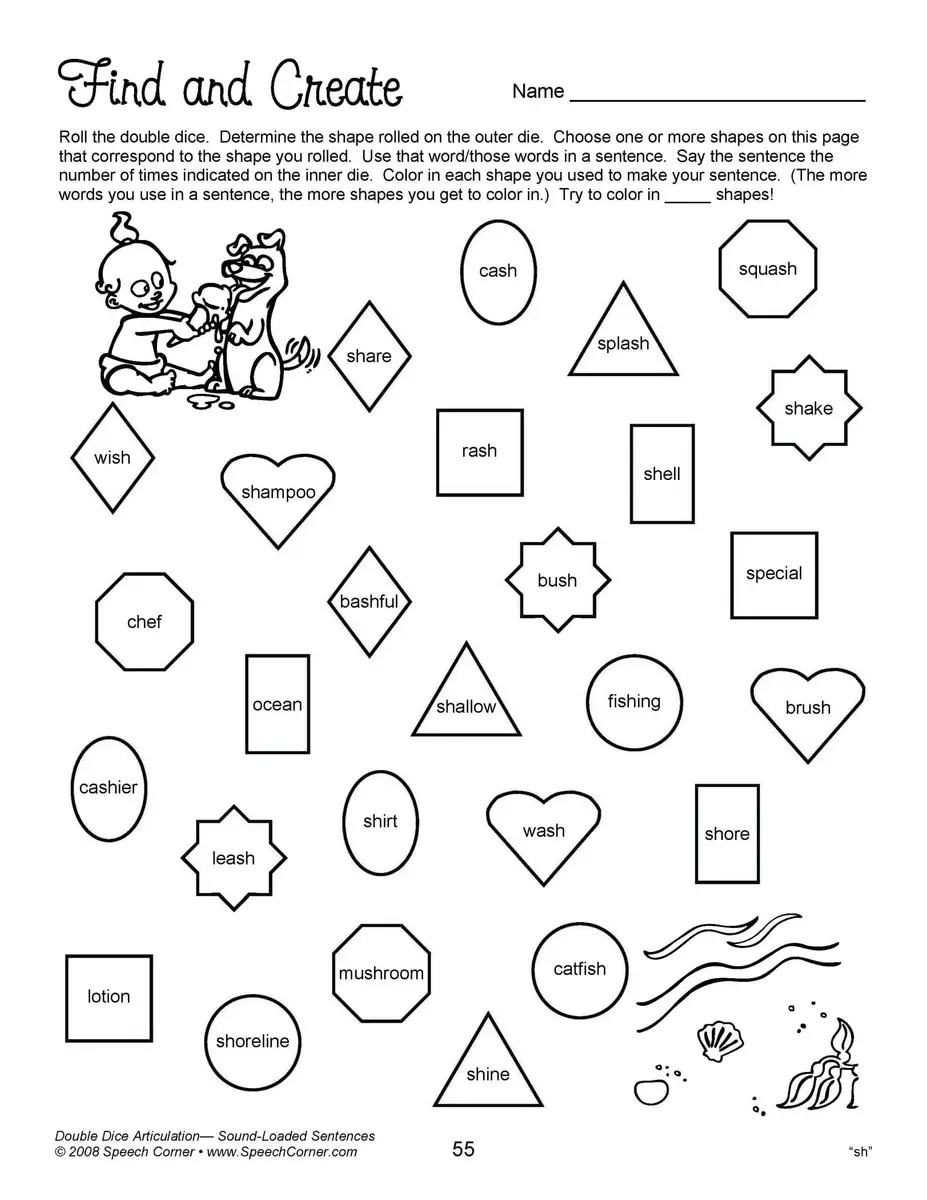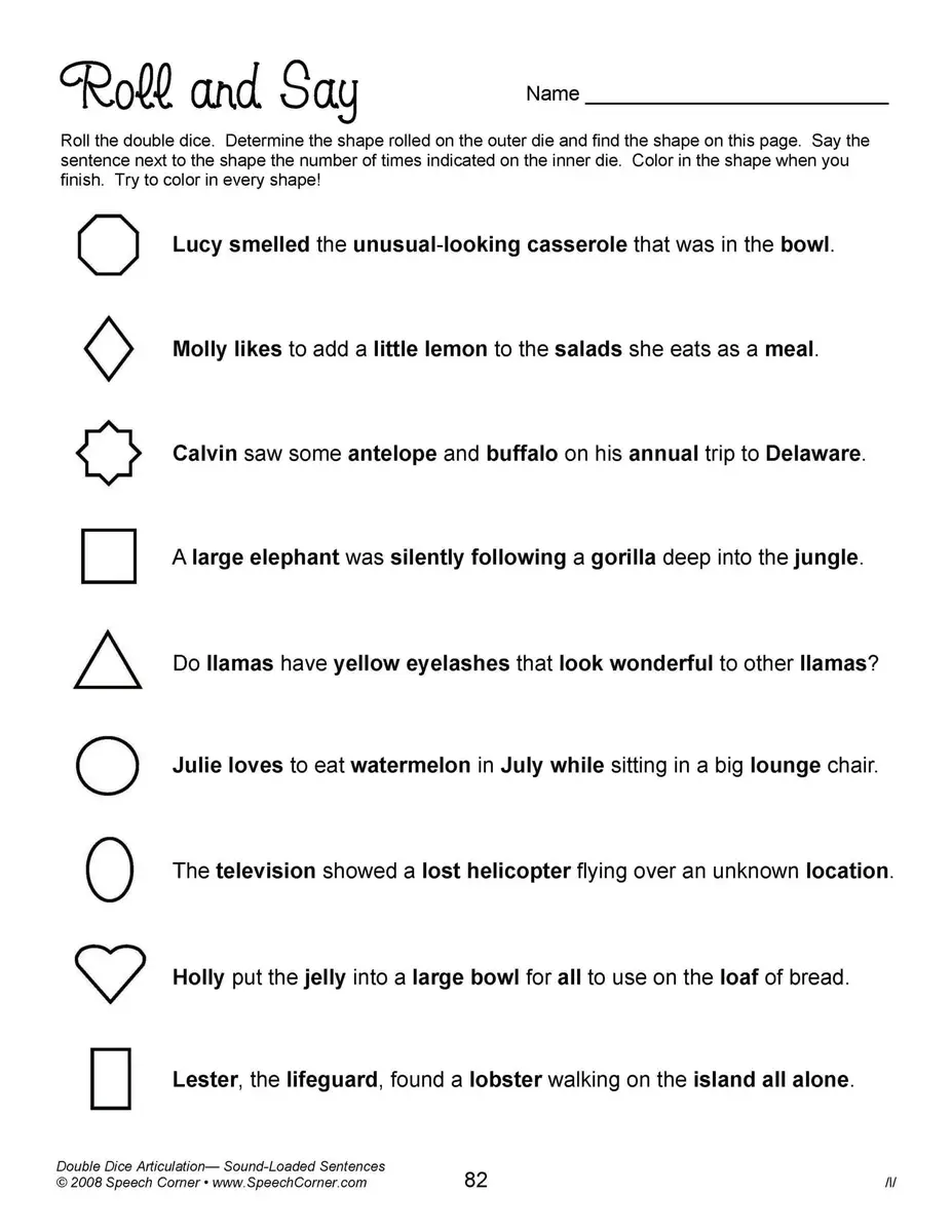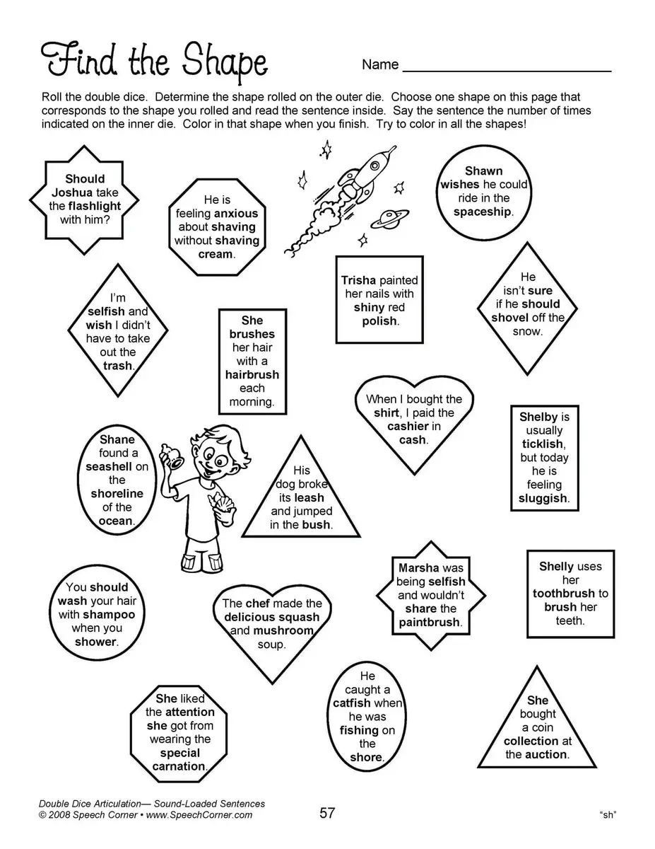 - Reproducible worksheets for /k/, /g/, /f/, “th,” “sh,” “ch,” “j,” /l/, /l/ blends, prevocalic /r/, “ar,” “or,” “ire,” “air,” “ear,” “er,” /r/ blends, /s/, and /s/ blends, all in sound-loaded sentences.