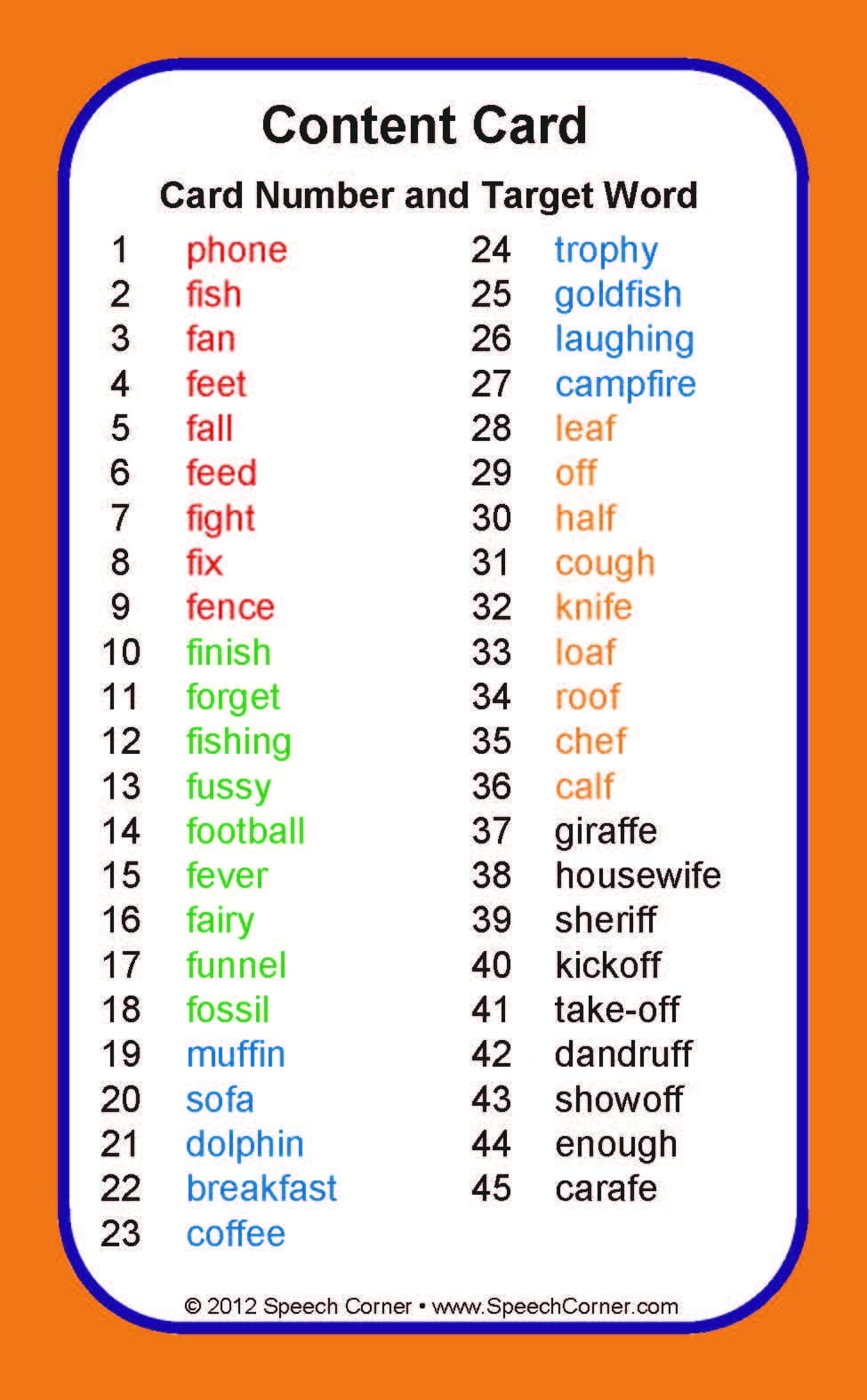 ✔️ 45 large-format playing cards with F target words and colorful photographs