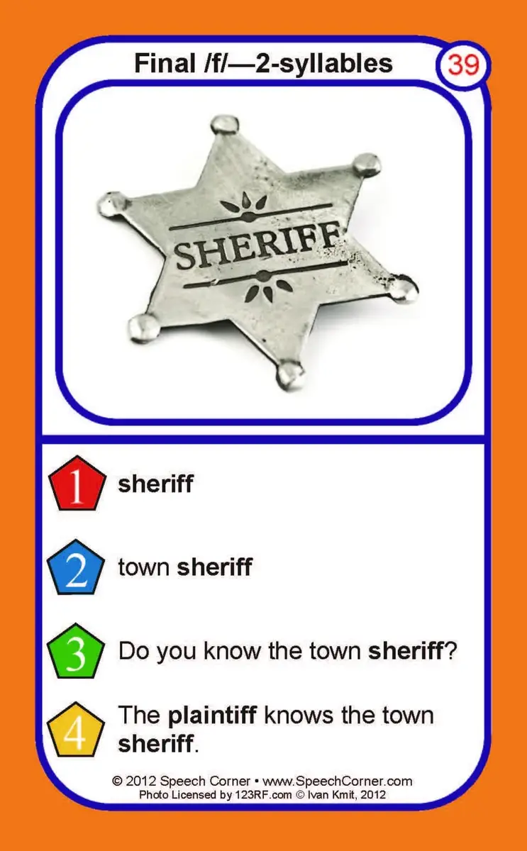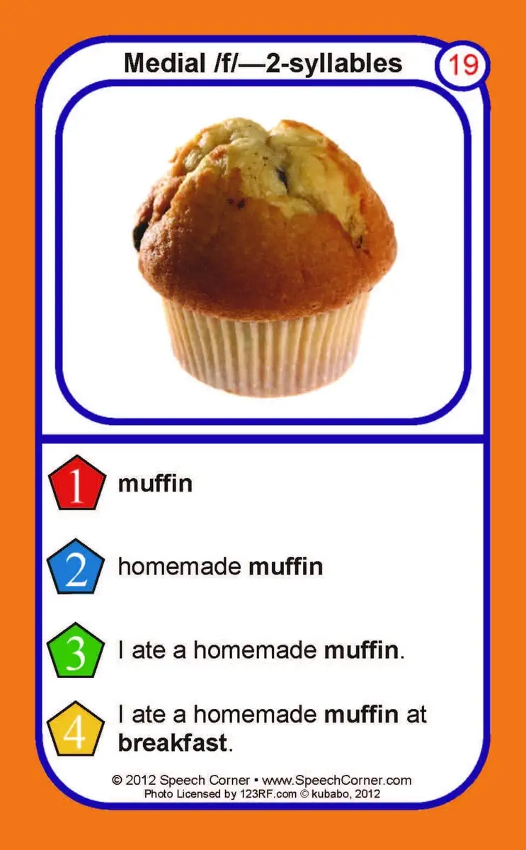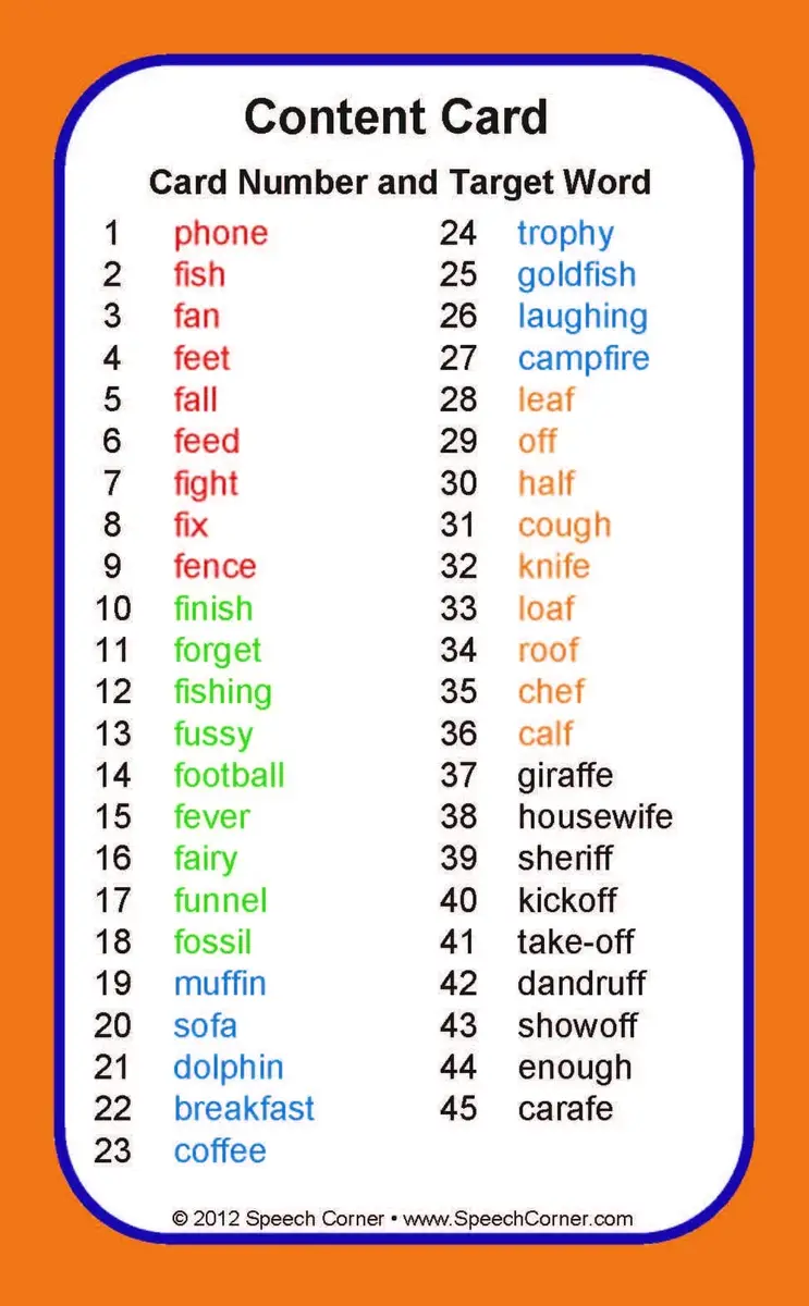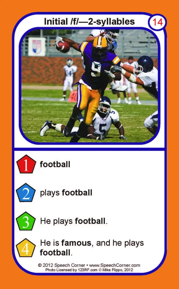 Each card features colorful photos of F target words organized by word position (initial, medial, final) and syllable count (1- or 2-syllable) for easy, structured practice.