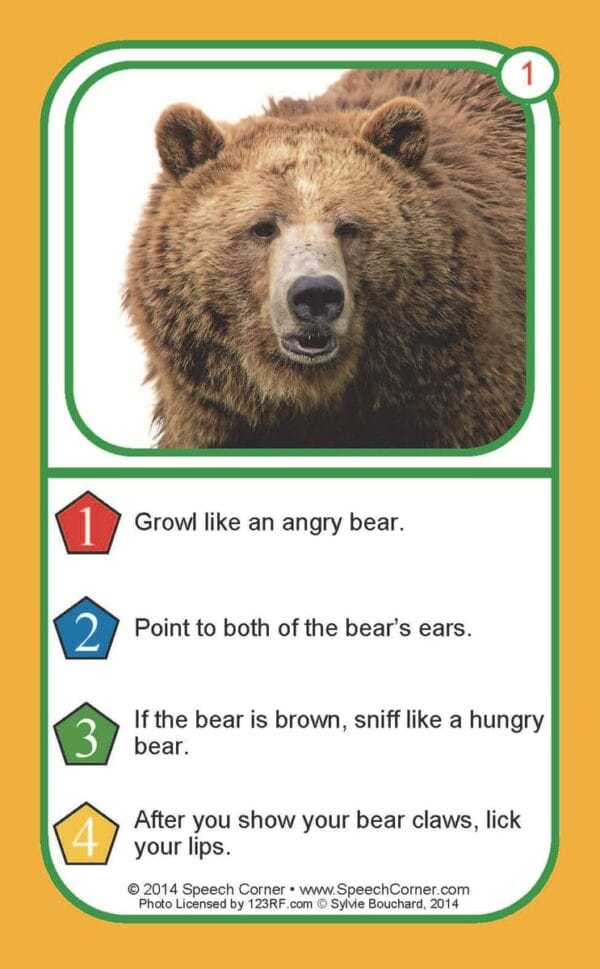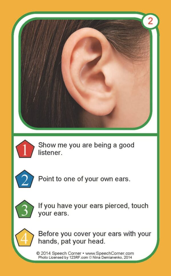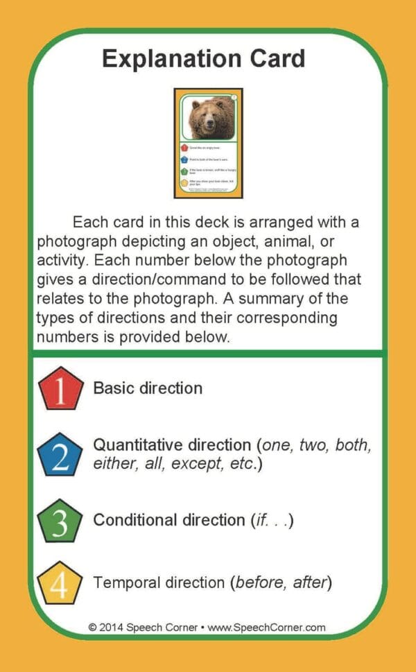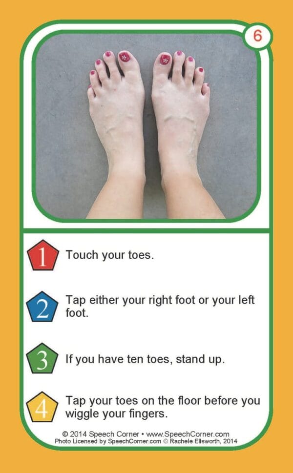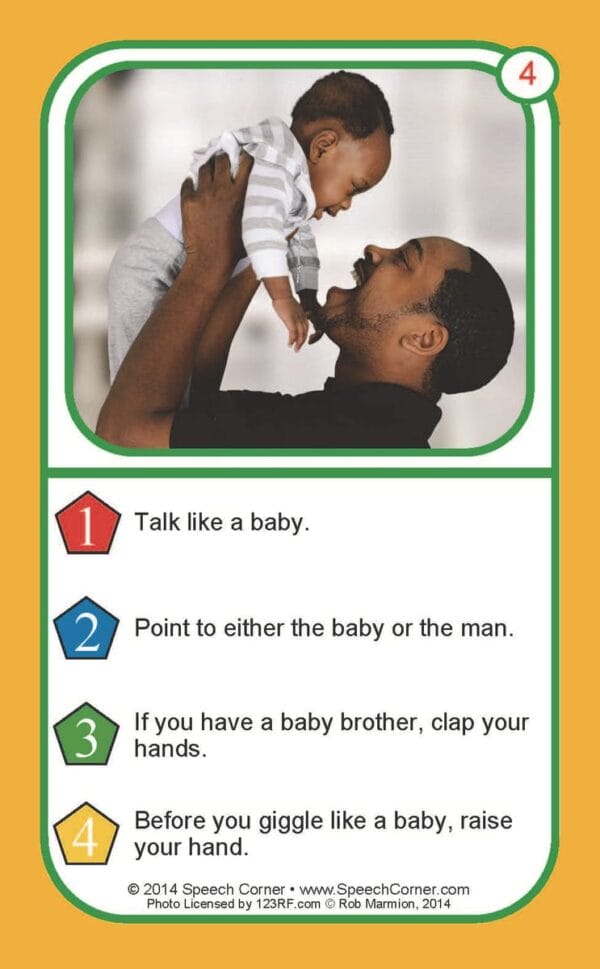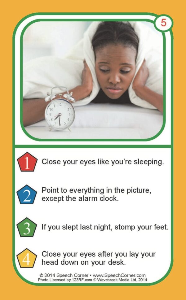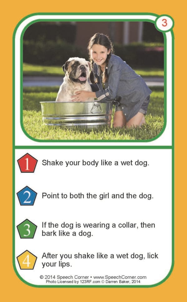Each 3″ x 5″ card features a photograph and four unique commands, giving students repeated opportunities to follow different types of instructions.