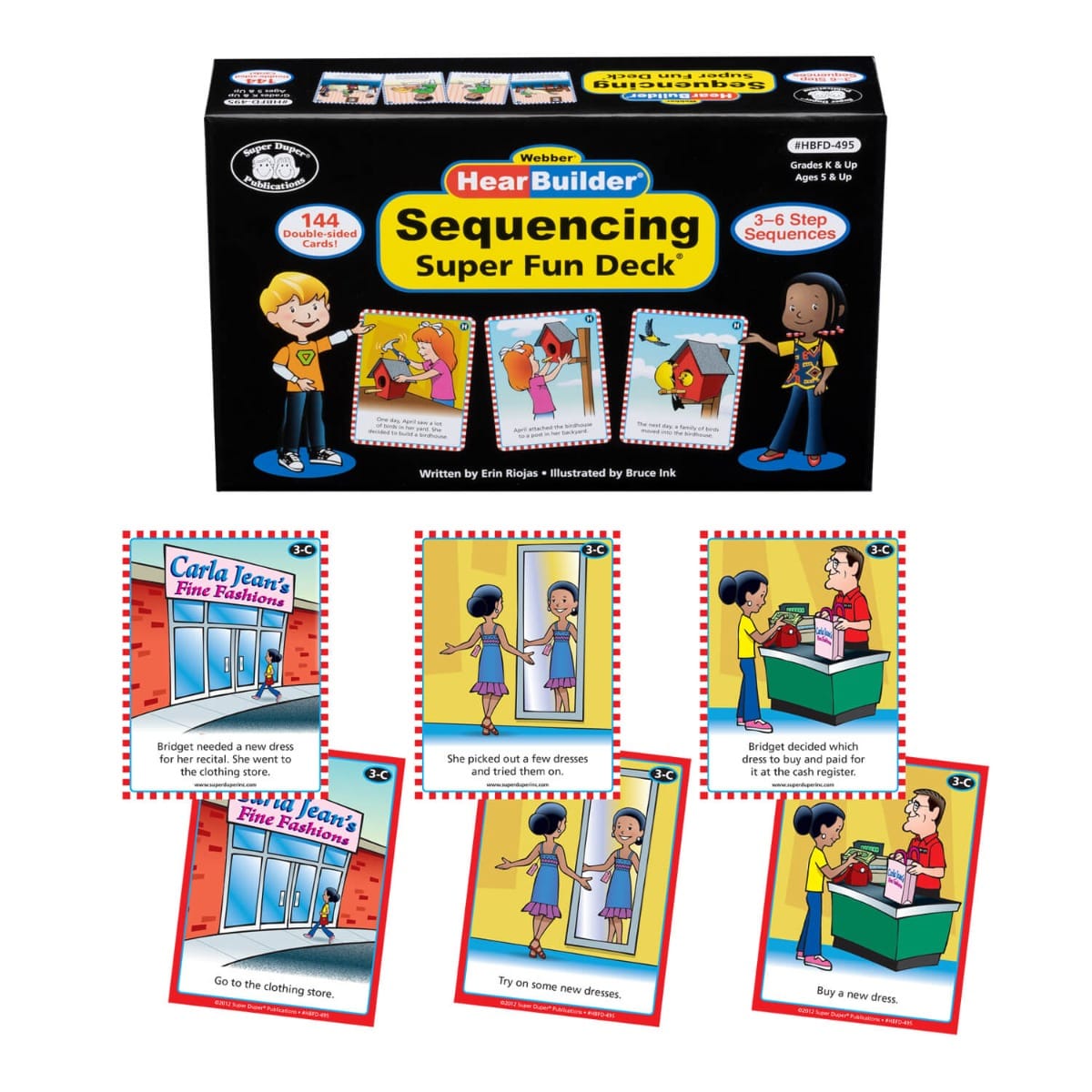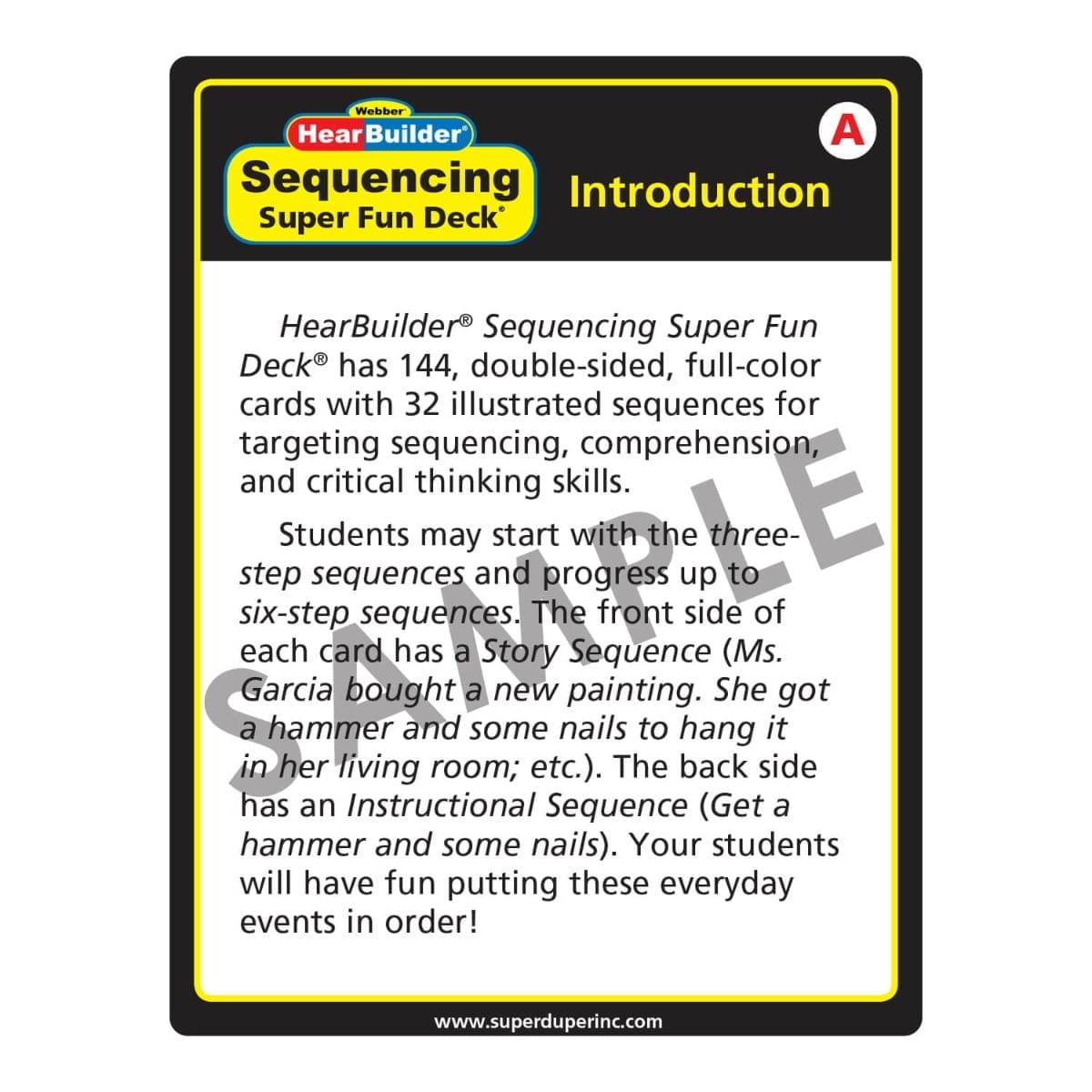 The HearBuilder Sequencing Super Fun Deck is packed with 144 double-sided, full-color cards featuring 32 illustrated sequences to help students strengthen sequencing, comprehension, and critical thinking skills. Whether used as a standalone resource or as a companion to the HearBuilder Sequencing software program, this deck makes learning logical order fun and engaging.