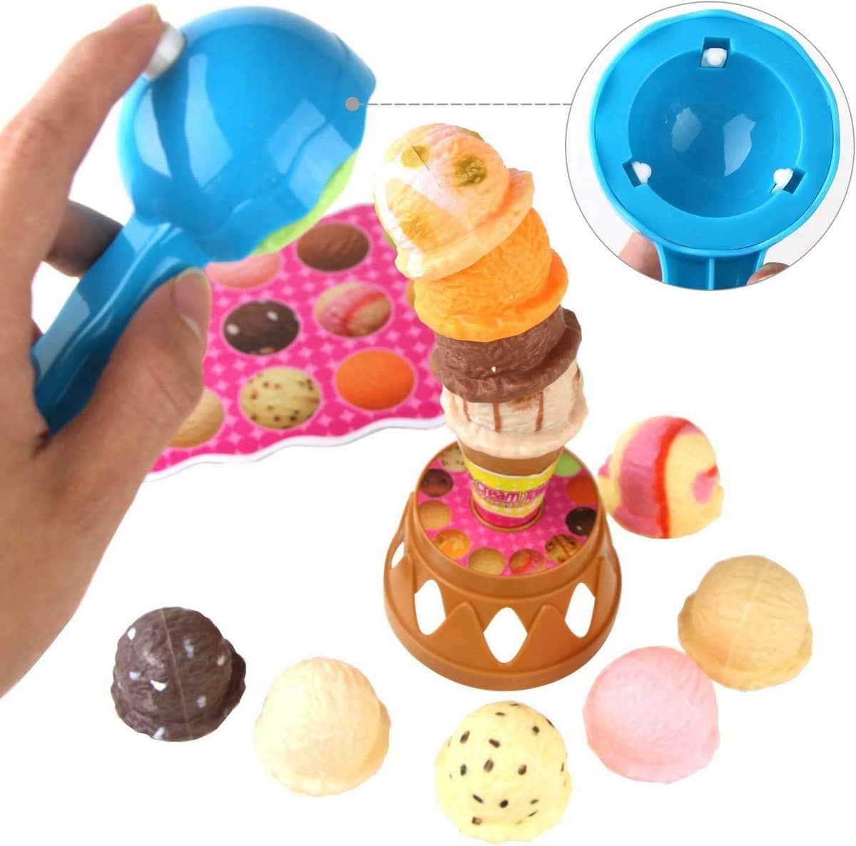 Each turn brings suspense and excitement as the cone wobbles under the growing tower of scoops. Children stay engaged while practicing patience, hand–eye coordination, and turn-taking.