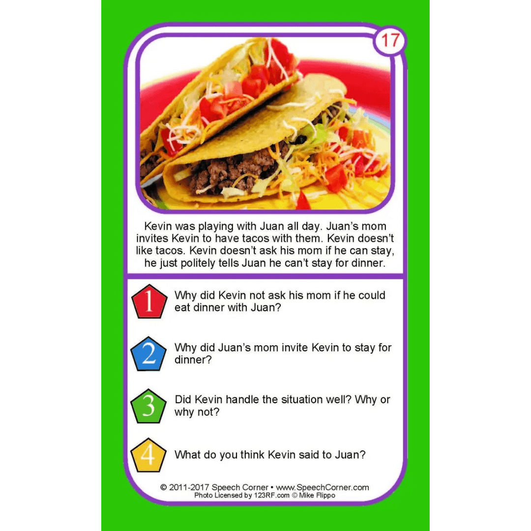 Each card presents a realistic photograph and a short description of a social situation, followed by four inference-based questions that encourage students to interpret what’s happening, why it matters, and what might come next.