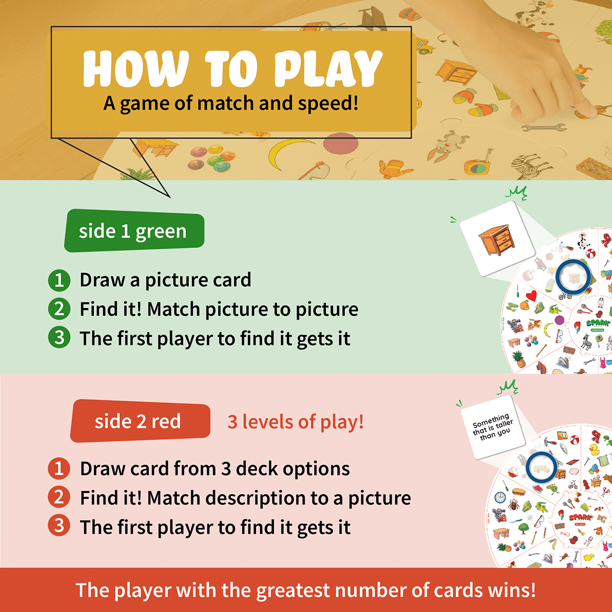 Whoever finds it first wins the card. The player with the most cards at the end wins the game!
