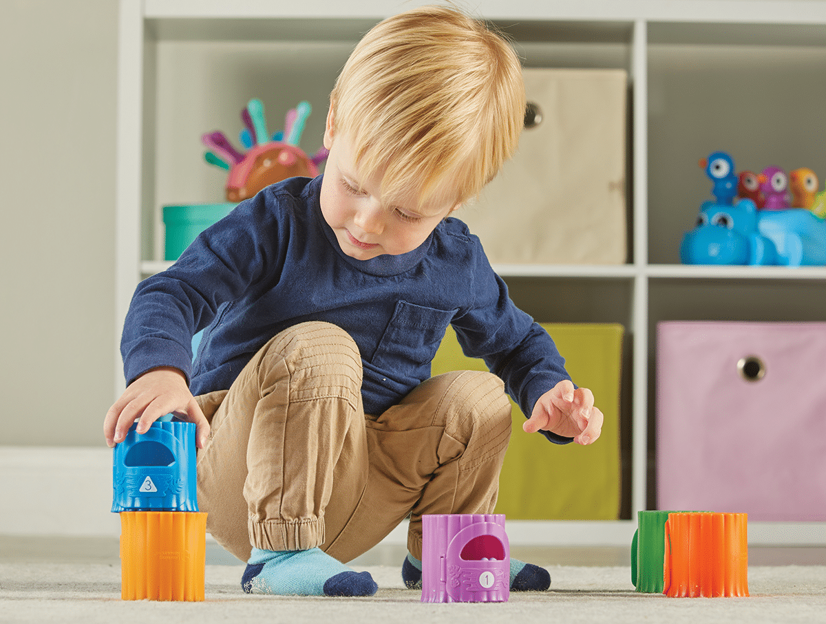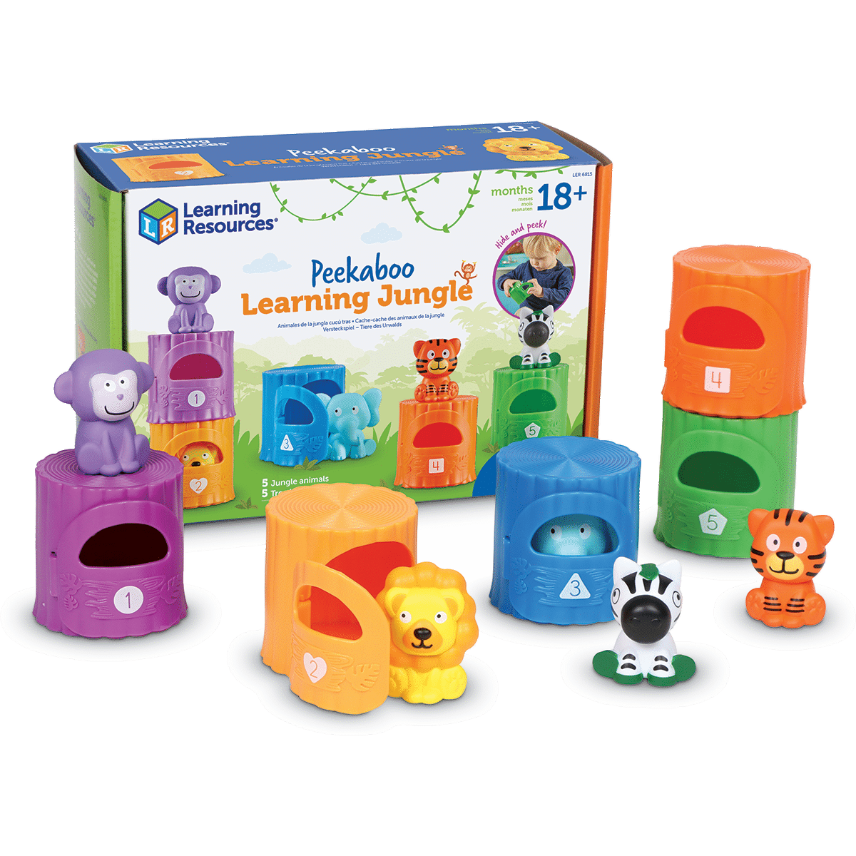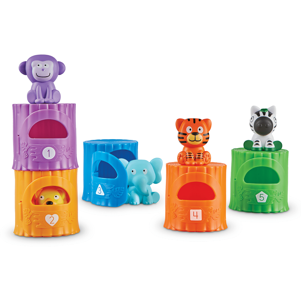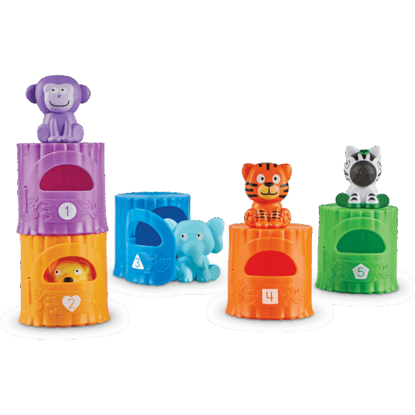 Get ready for hide & peek fun! Five colorful jungle animals—tiger, lion, zebra, elephant, monkey—peek from the windows of stackable tree houses for counting, color matching, and fine-motor play. Open the hinged doors, find the animal, and match it to the house by color. Build a tall treetop tower or line them up for 1–5 counting games. (Tree base measures approx. 3″ × 3″ × 2.75″.)