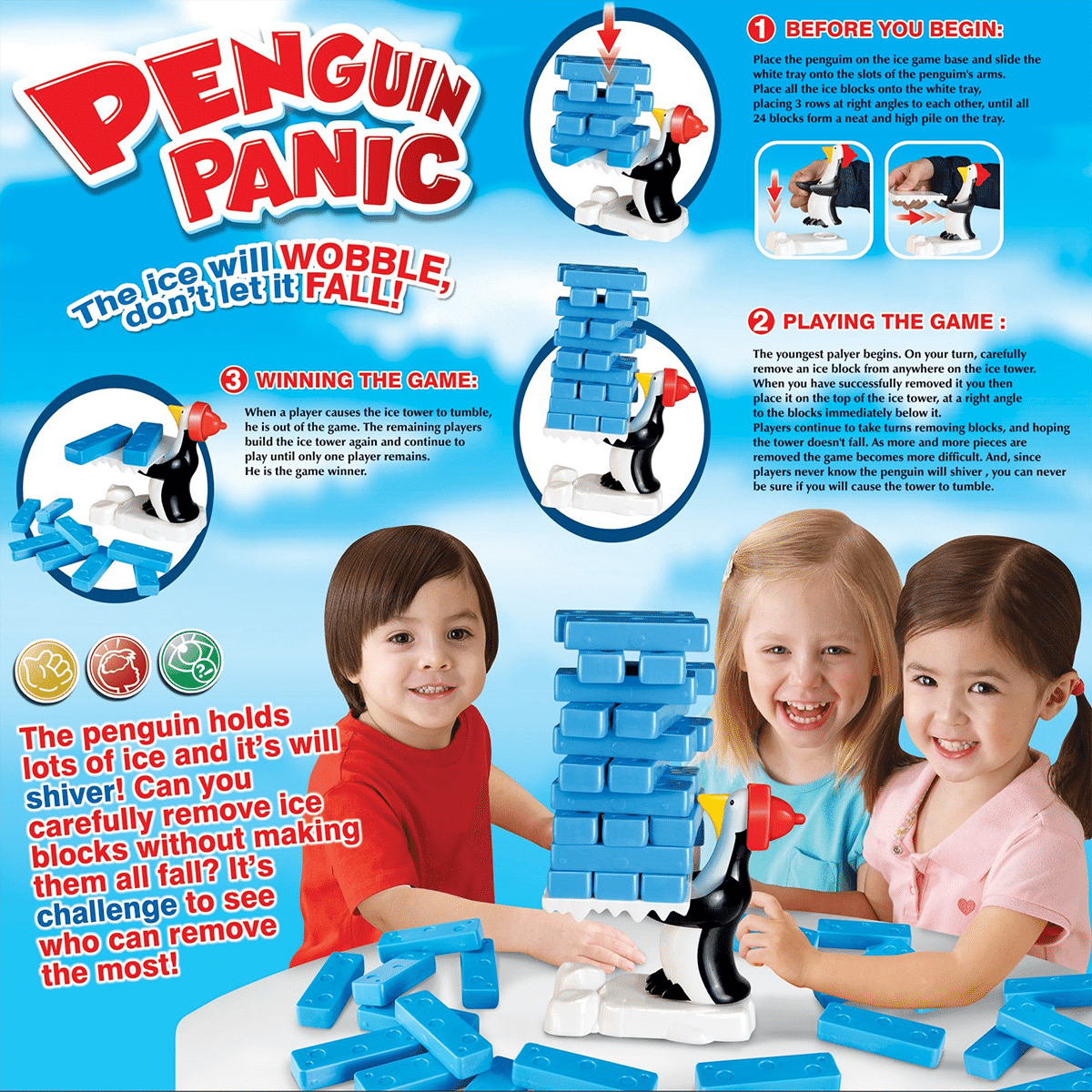 - Two Ways to Play – Remove and re-stack ice Jenga-style, or add blocks one by one for a build-up challenge.