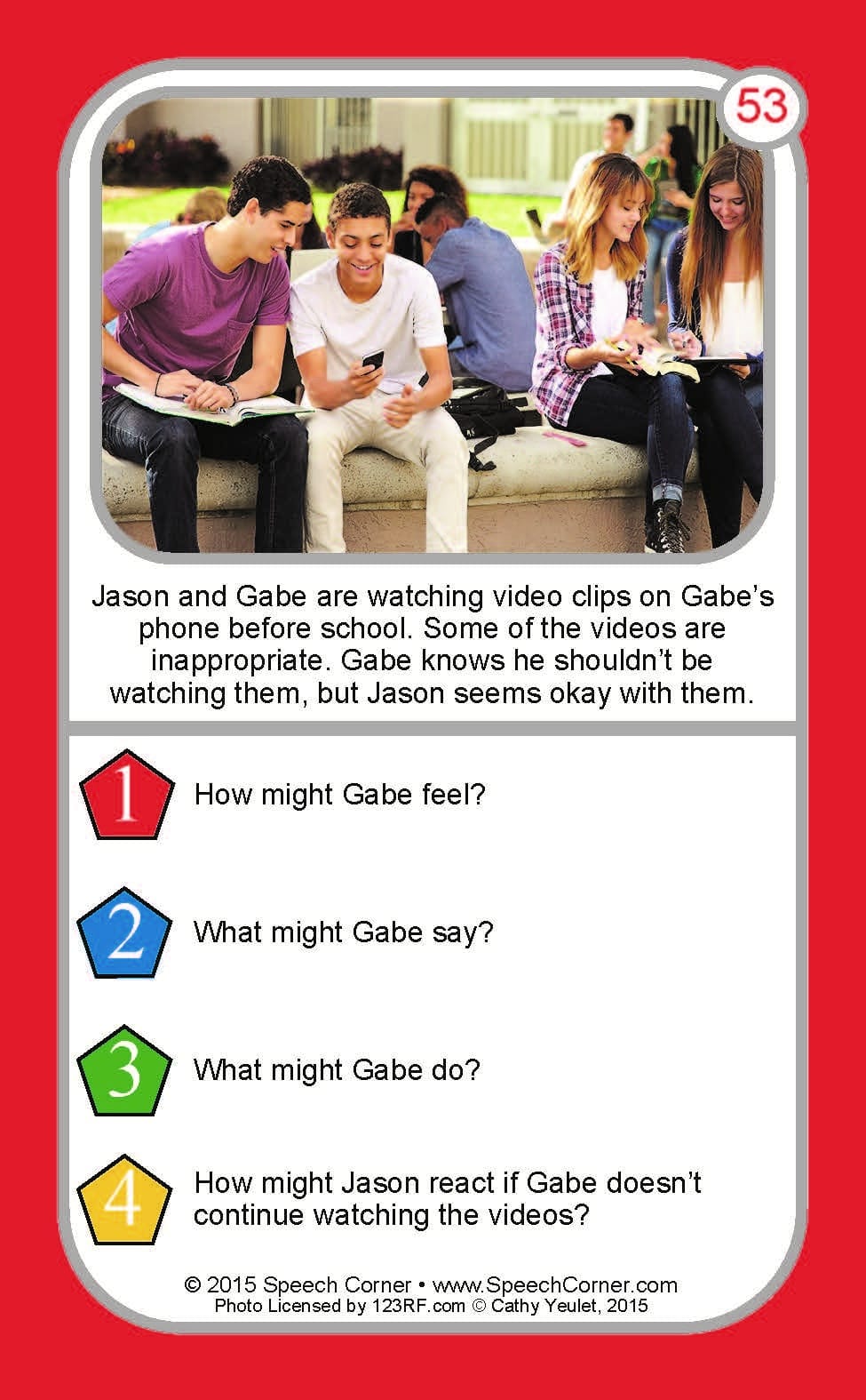 ✔️ 54 large-format playing cards (3″ x 5″) with photos, short social stories, and 4 pragmatic follow-up questions per card (216 total!)