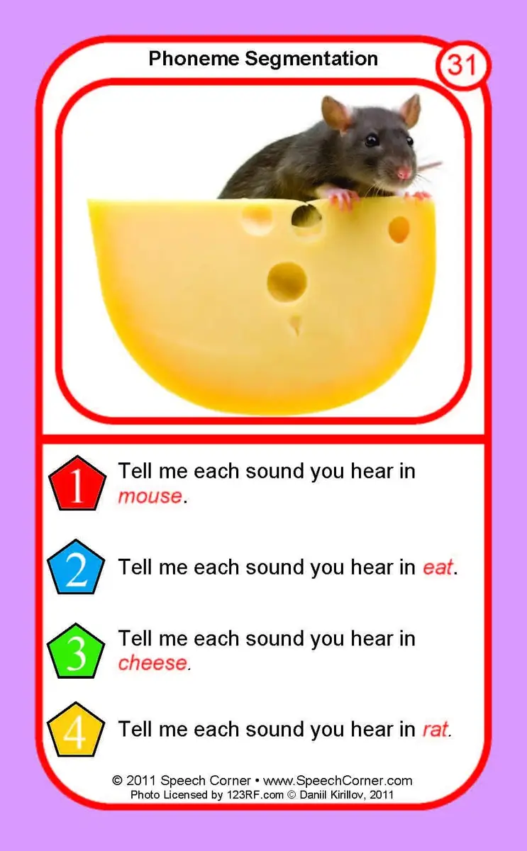 Each card features a vivid photograph and four unique phonological awareness tasks, helping students develop sound manipulation skills essential for decoding and spelling.