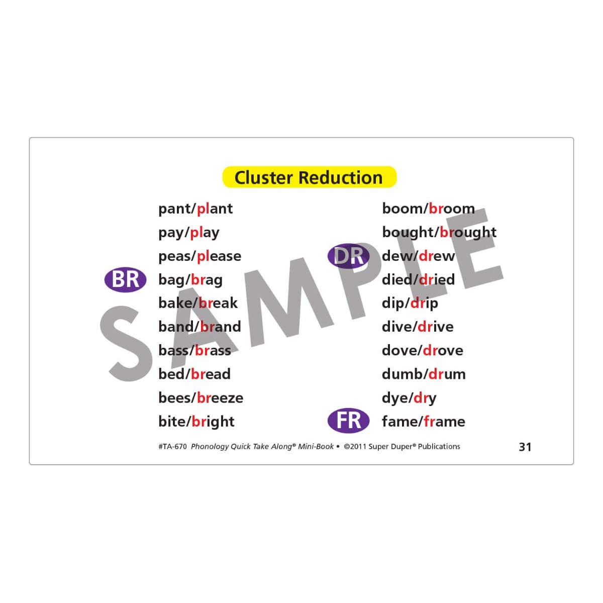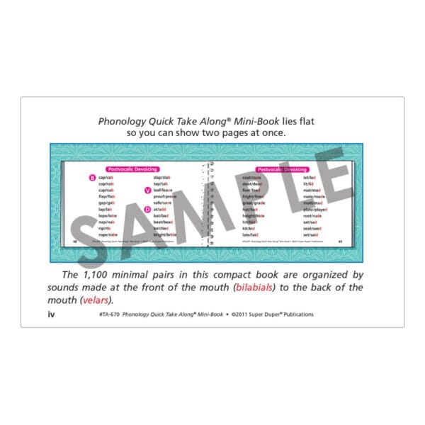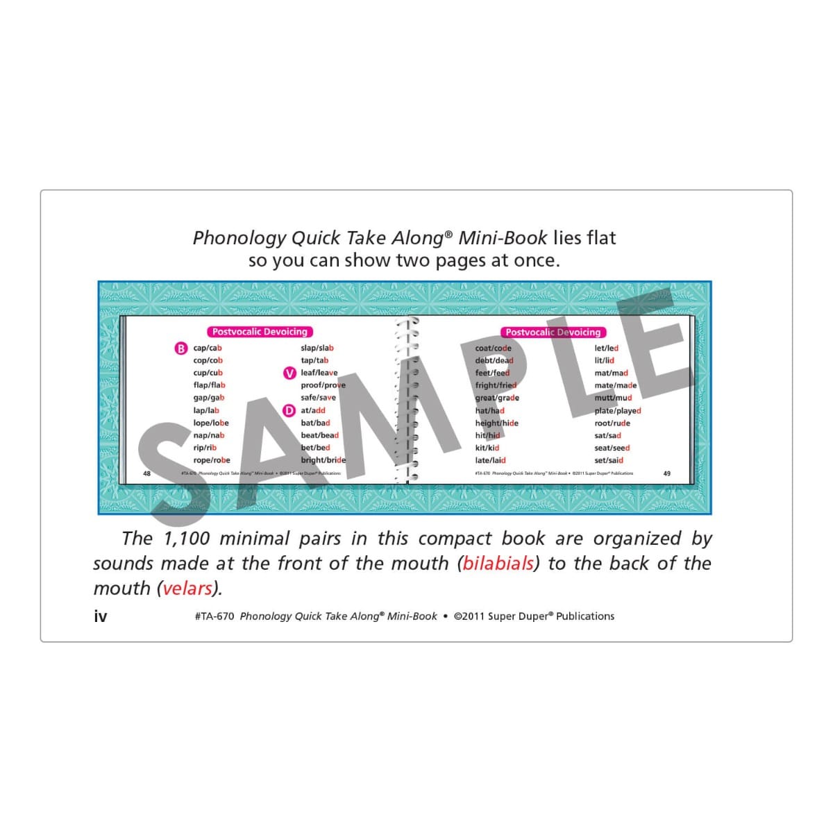 The Phonology Quick Take Along mini-book is a portable, pocket-sized resource designed for busy speech-language pathologists, special educators, teachers, and parents. Perfect for on-the-go use, this handy tool features 1,100 minimal pairs that target 10 key phonological processes, making it ideal for informal screenings or therapy sessions.