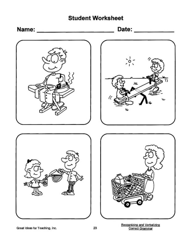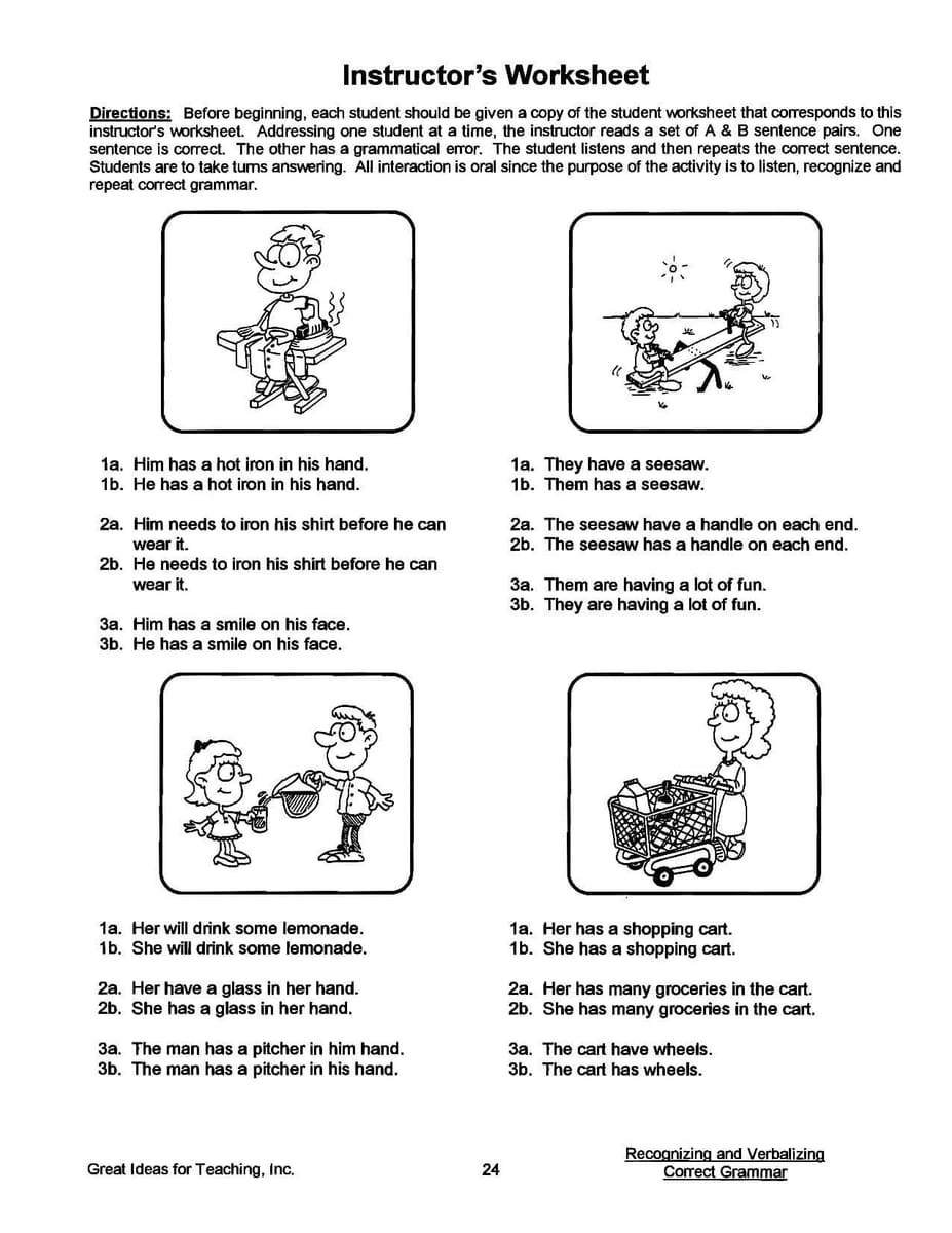 The students look at a picture while two similar statements are read about the picture. One statement uses correct grammar and the other statement uses incorrect grammar. The child’s internal language system recognizes the correct grammar and the child then repeats the correct statement. Each lesson has three pairs of statements for each picture, with four pictures used in each lesson. (12 examples of comparative grammar statements on each activity page.) It is great practice for young children who need help in grammar.