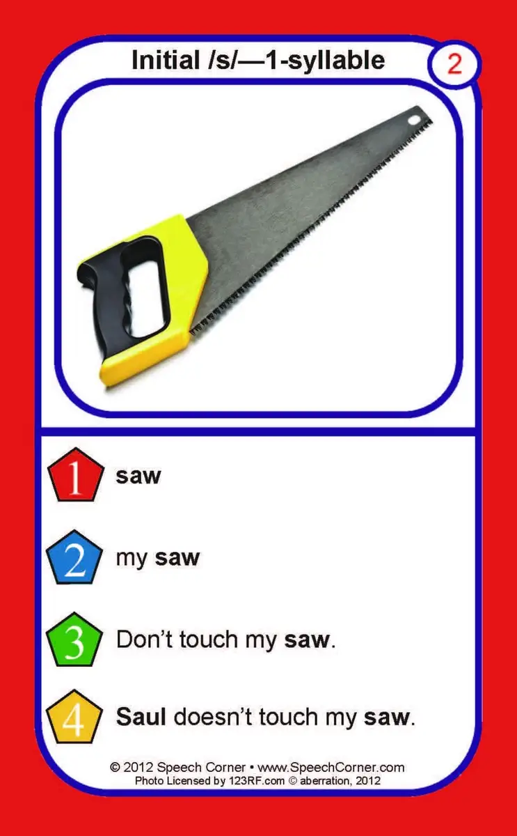 Prompts for single word, phrase, sentence, and sound-loaded sentence practice