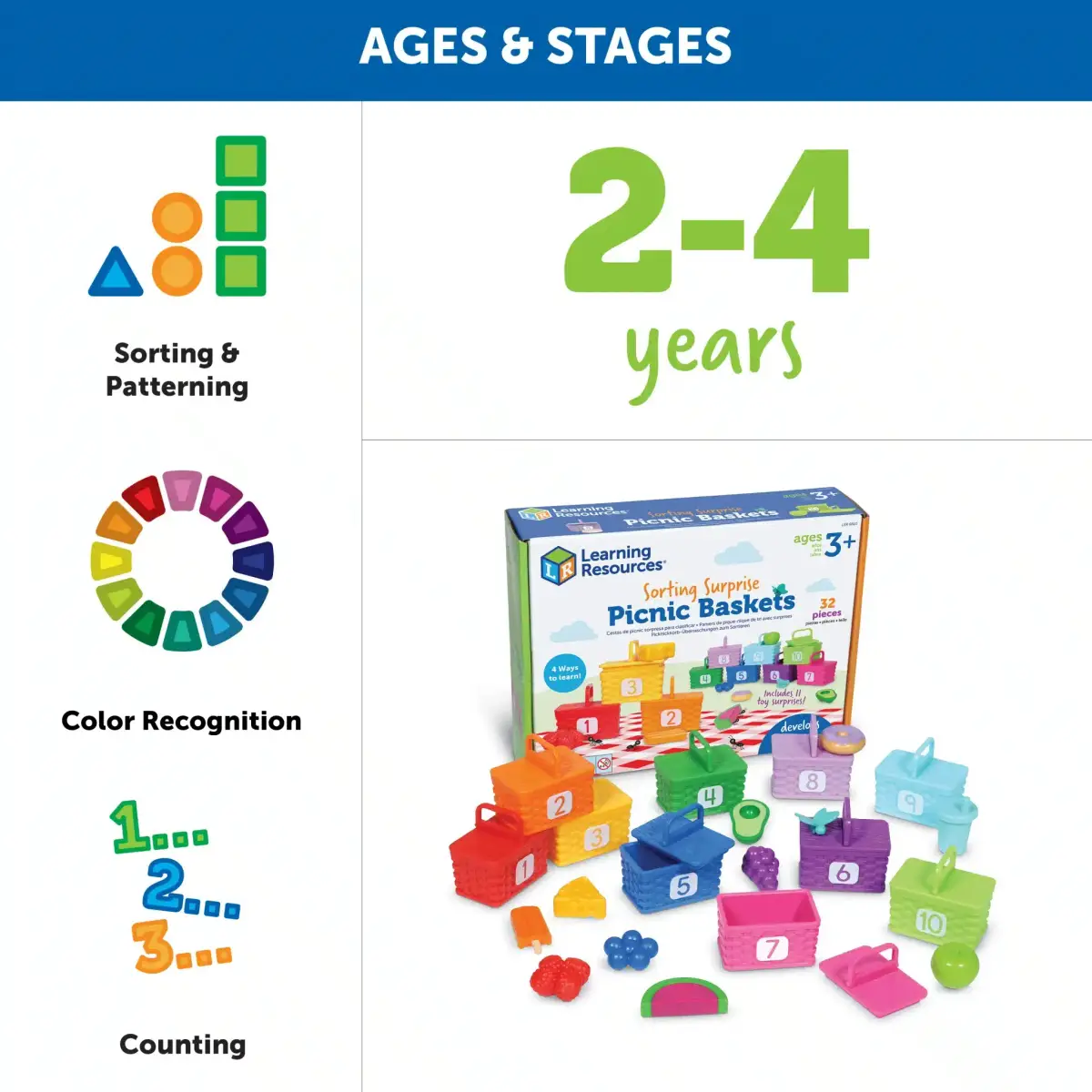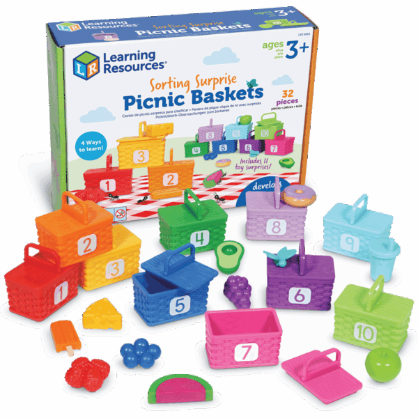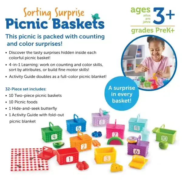 Lift the lids and learn! Discover 10 colorful food surprises tucked inside 10 mini picnic baskets. Kids can sort by color and attributes, practice counting, and build fine-motor skills as they grasp, place, and play. The full-color activity guide even doubles as a picnic blanket for instant pretend play.