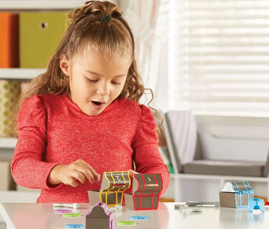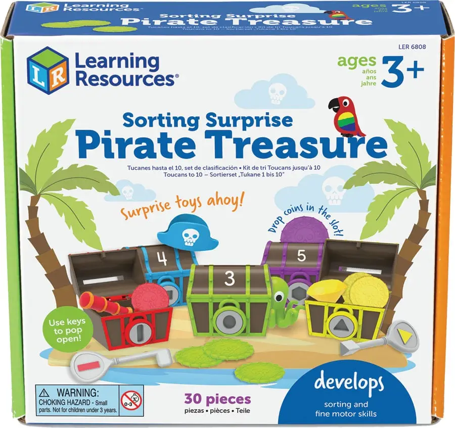Ahoy, little learners! Unlock fine-motor fun and early sorting & matching skills with five numbered pirate chests—each hiding a colorful surprise toy. Use the right key shape to open each chest, discover the treasure inside, and sort the 15 coins by color to match their mates. Pop, unlock, and play—again and again!