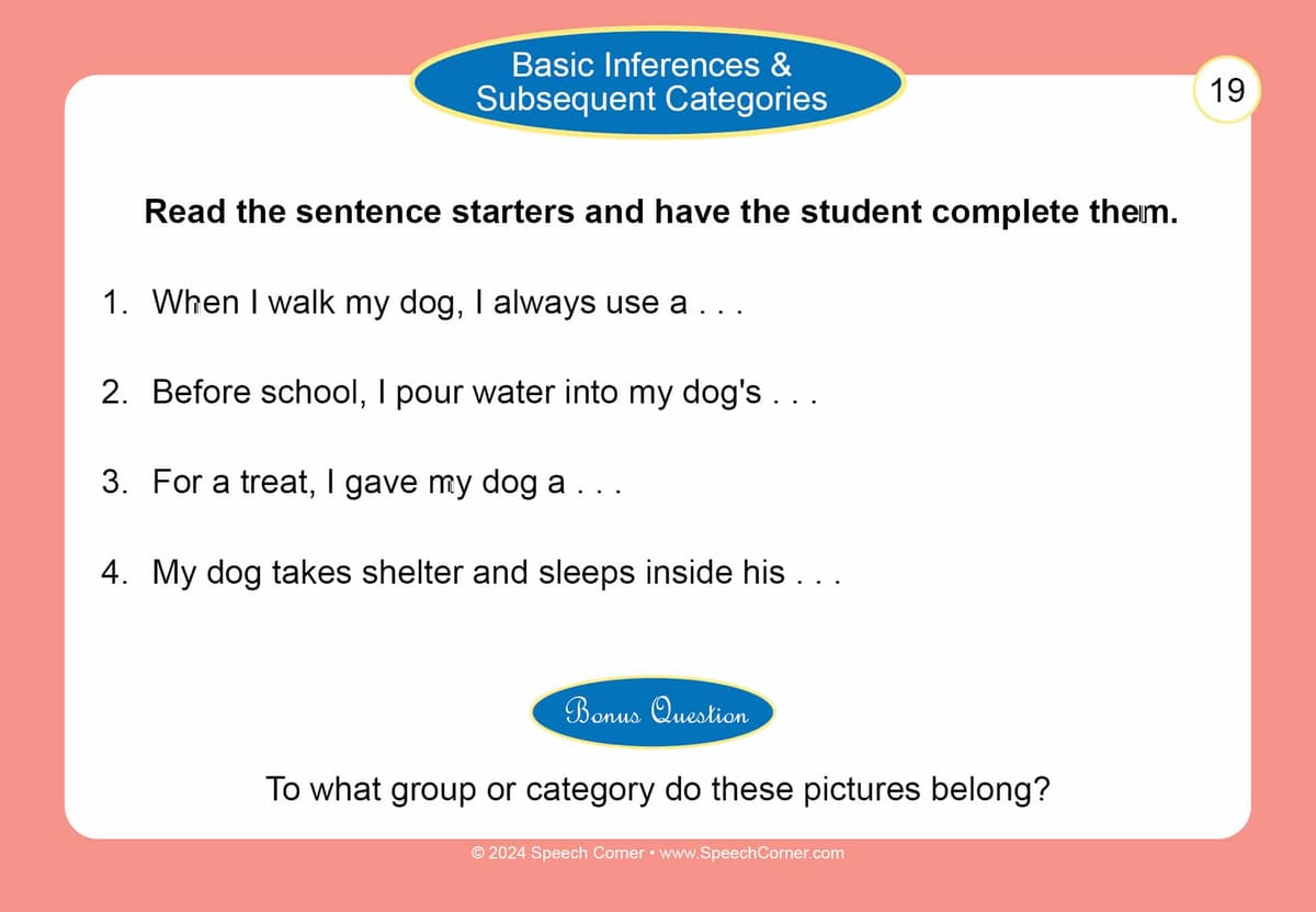 Basic Inferences & Subsequent Categories (SC-202): Teaches students to infer meaning and then classify the item or situation into an appropriate category.
