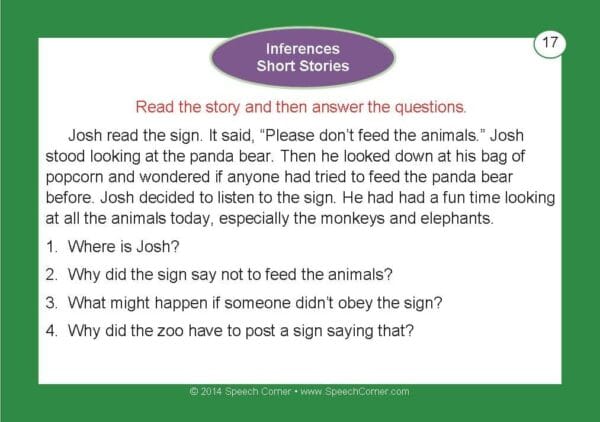Inferences (SC-215): Develops logical reasoning through short stories with follow-up questions.