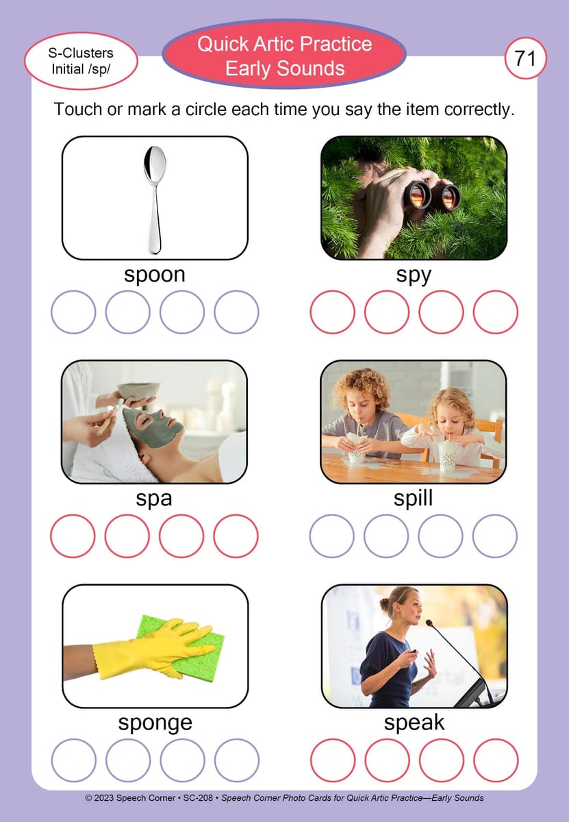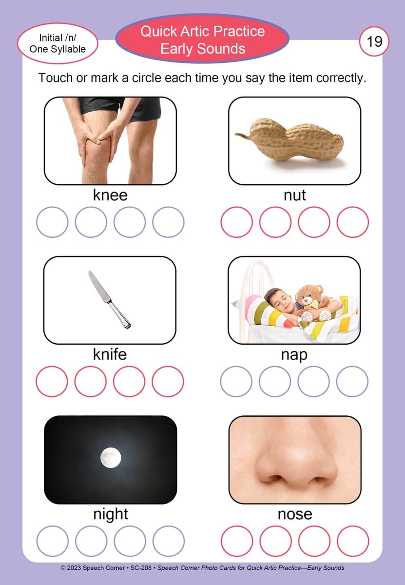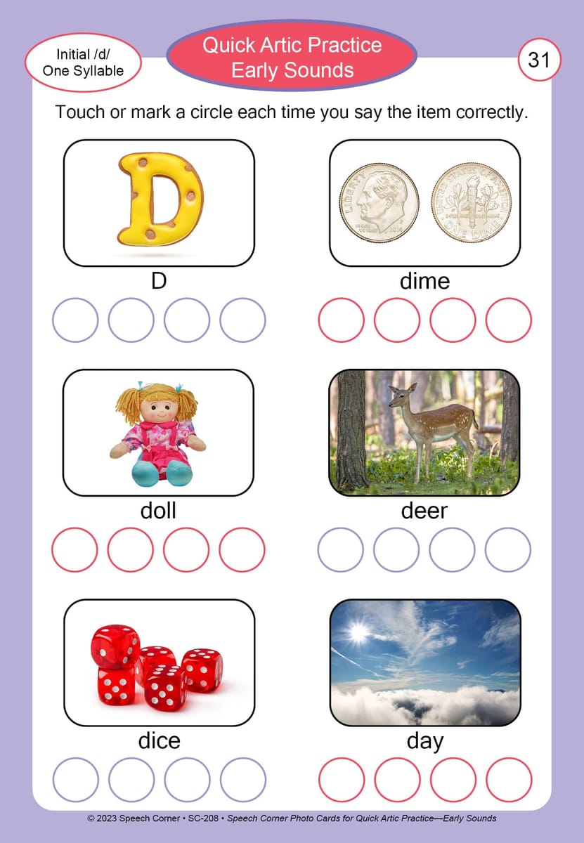 Quick Artic Practice – Early Sounds (SC-208): Provides rapid articulation practice for early-developing sounds such as /p, b, m, n, t, d, w, h/.