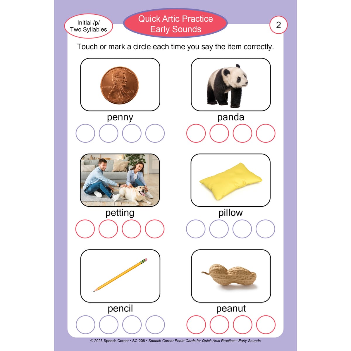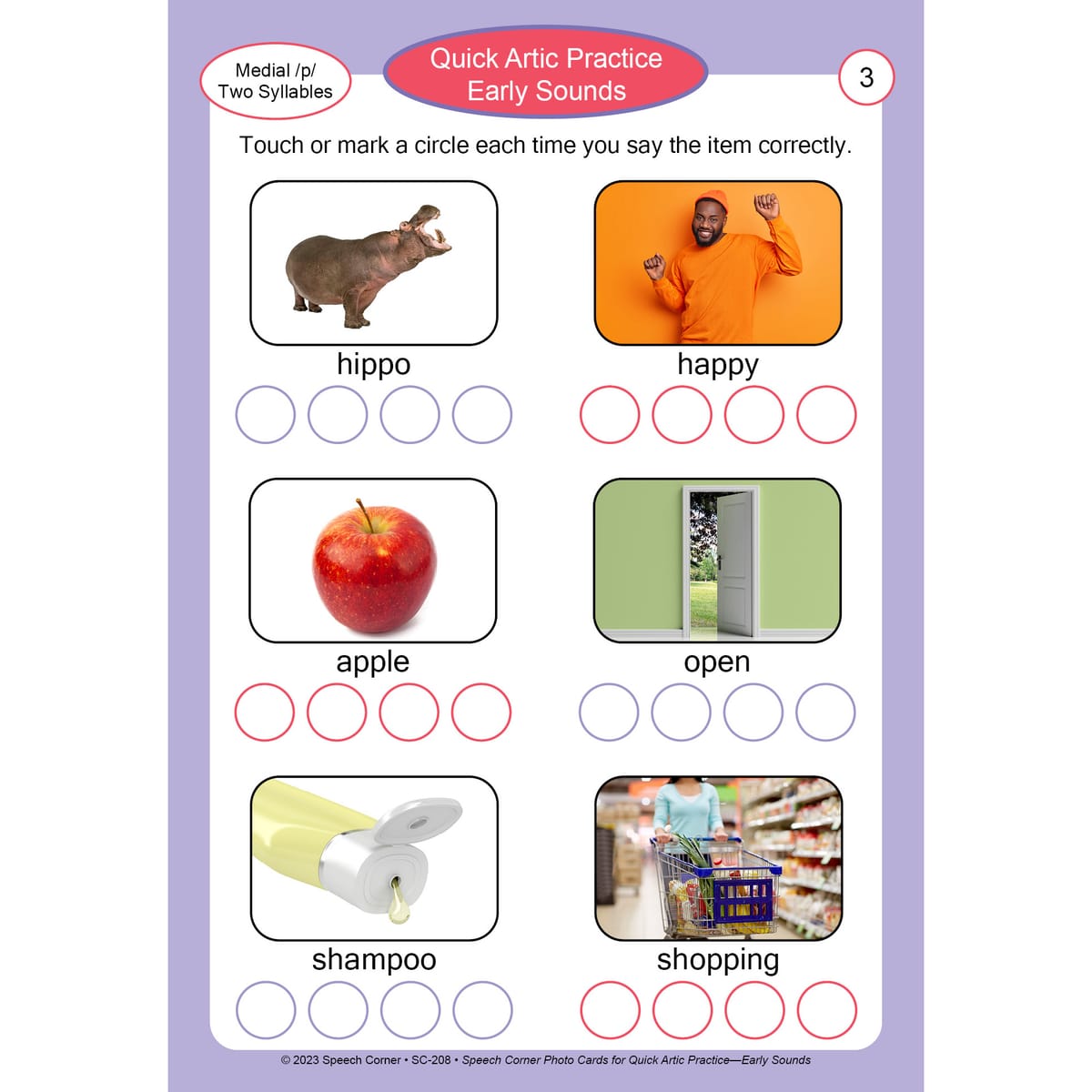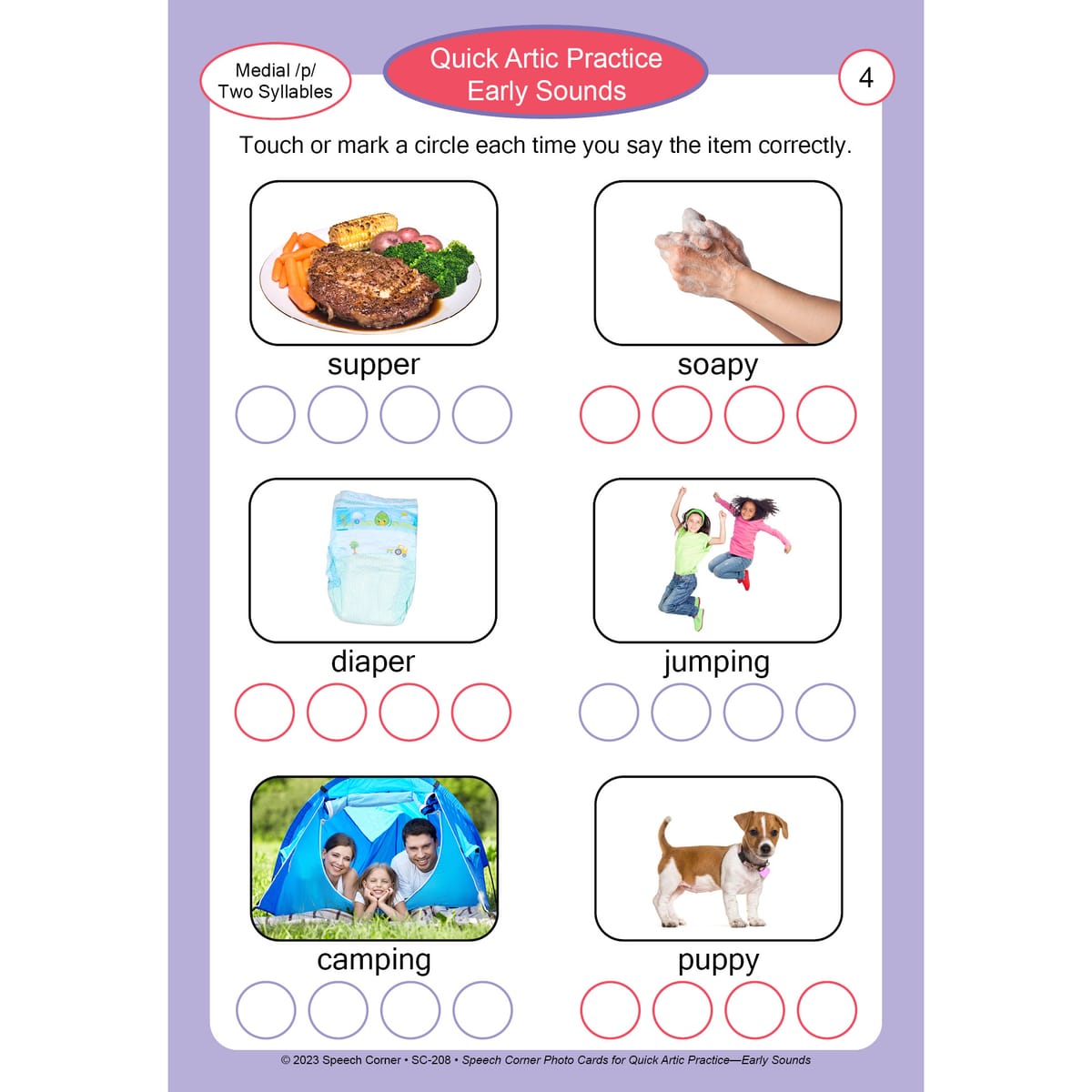 Quick Artic Practice – Early Sounds (SC-208): Provides rapid articulation practice for early-developing sounds such as /p, b, m, n, t, d, w, h/.