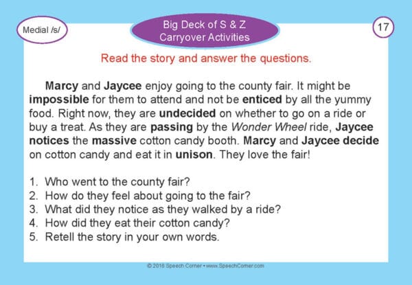 Help your students transition from sound production to real-world communication with the Big Deck of S & Z Carryover Activities. Designed for learners of all ages—especially older students—this set features vibrant photo cards paired with 75 structured activities to make carryover practice interactive, meaningful, and fun.