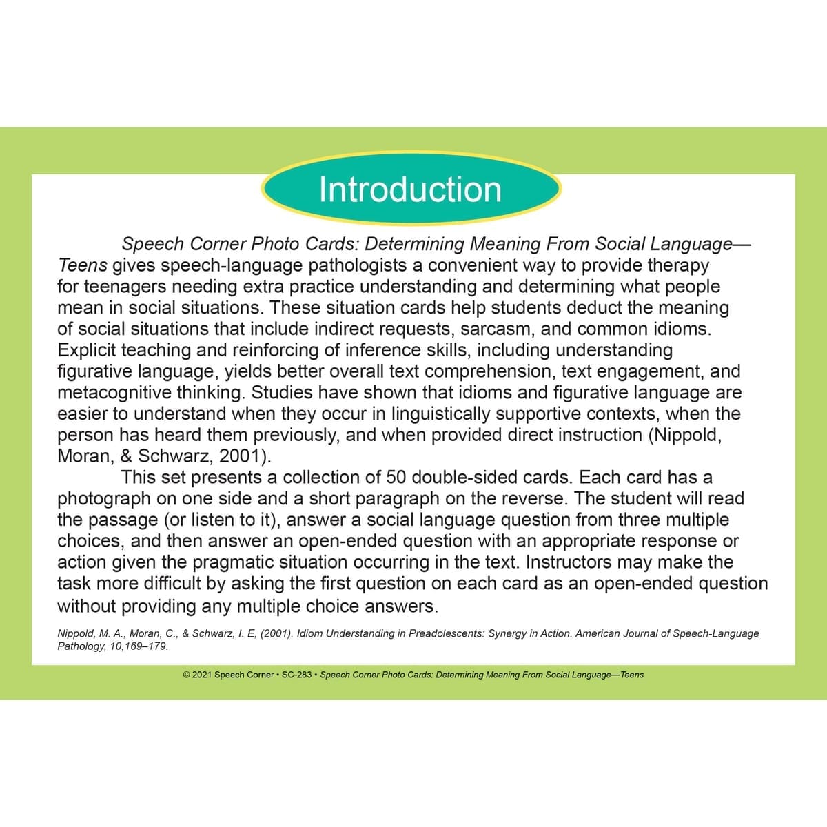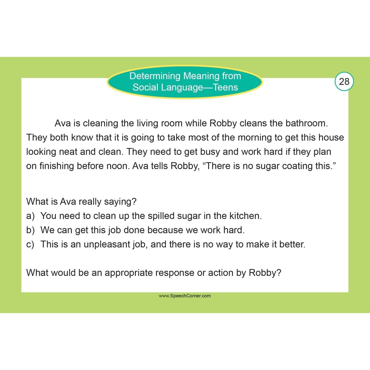 Take your social-cognitive therapy to the next level with Speech Corner Photo Cards for Determining Meaning from Social Language. This specialized resource is designed to bridge the gap between literal interpretation and true social understanding. Specifically geared for teenagers, these cards provide the high-level practice needed to navigate the complex world of indirect communication, humor, and social subtext.