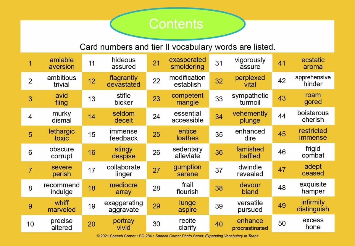 Includes: 50 double-sided cards, 100 Tier II targeted vocabulary words