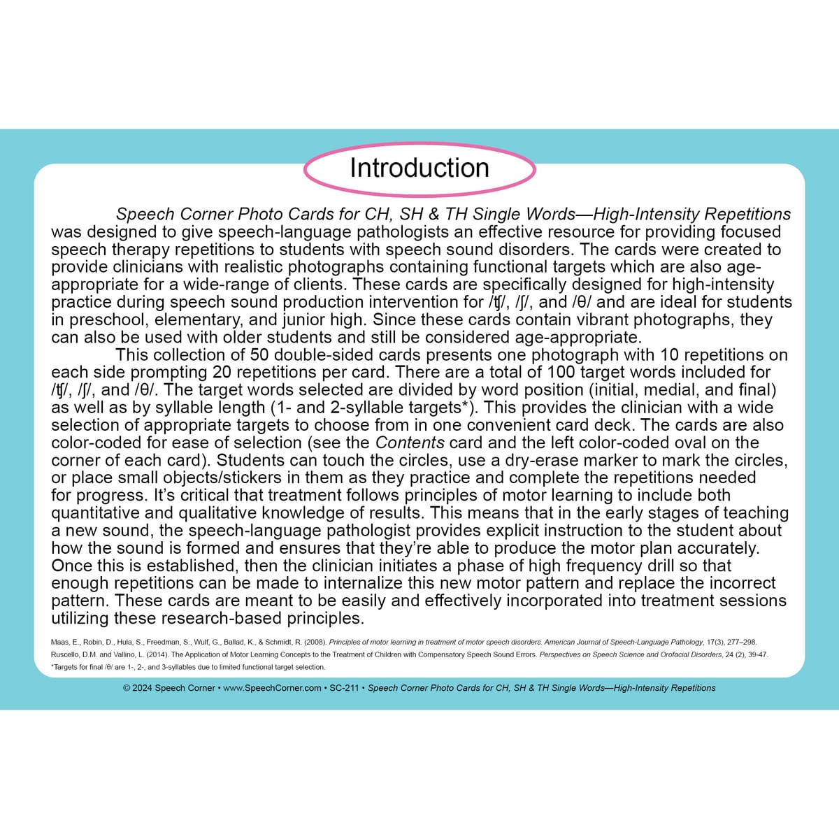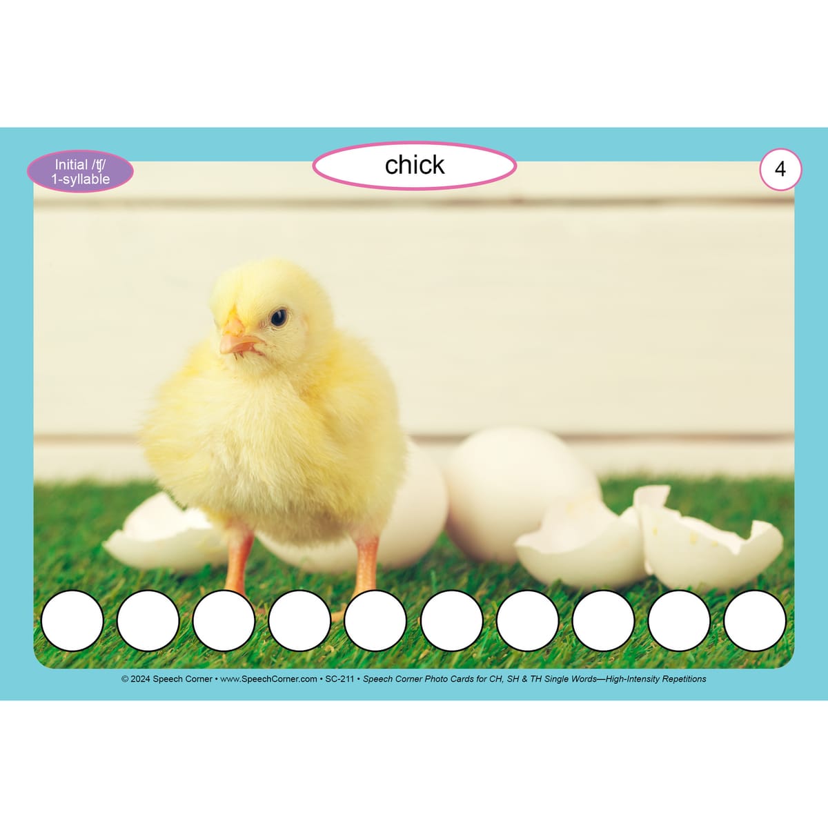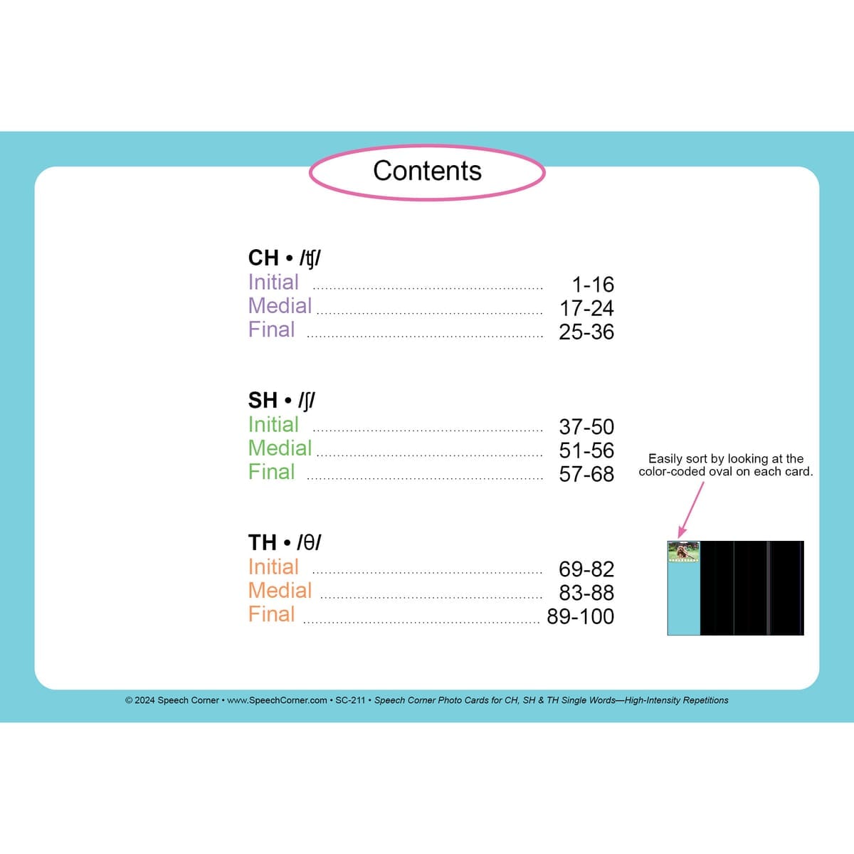 Repetition is key to mastering articulation, and Speech Corner’s Photo Cards for CH, SH & TH—Single Words (High-Intensity Repetitions) make it both measurable and motivating. With built-in visual tracking and 100 carefully selected target words, this set turns every drill into a goal-driven success.