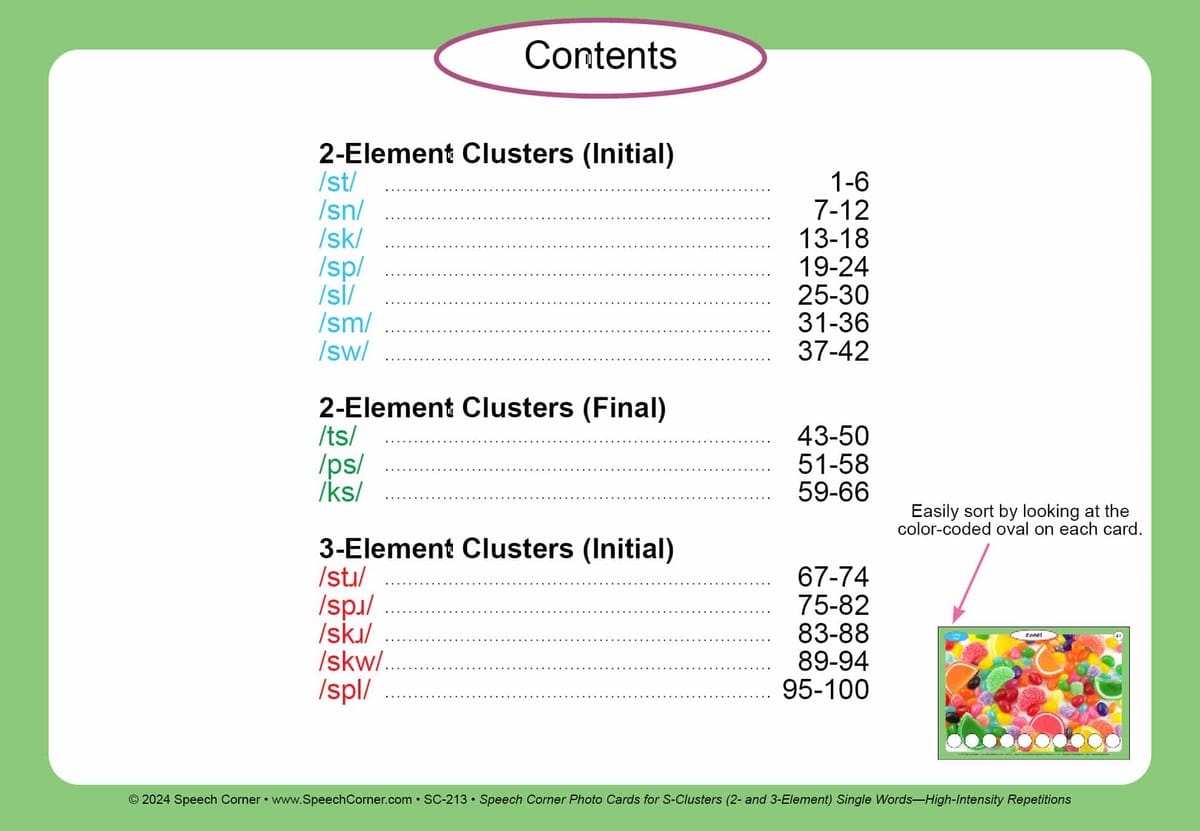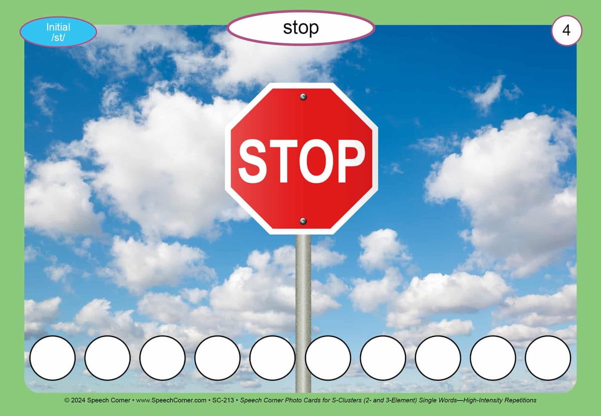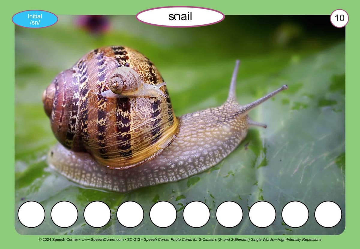 Give your students the focused articulation support they need with Speech Corner Photo Cards for S-Clusters 2 and 3-Element-Single Words—a dynamic tool for practicing both 2-element and 3-element /s/-clusters at the word level. With built-in repetition tracking and realistic photo stimuli, these cards turn drill-based sessions into goal-driven progress.