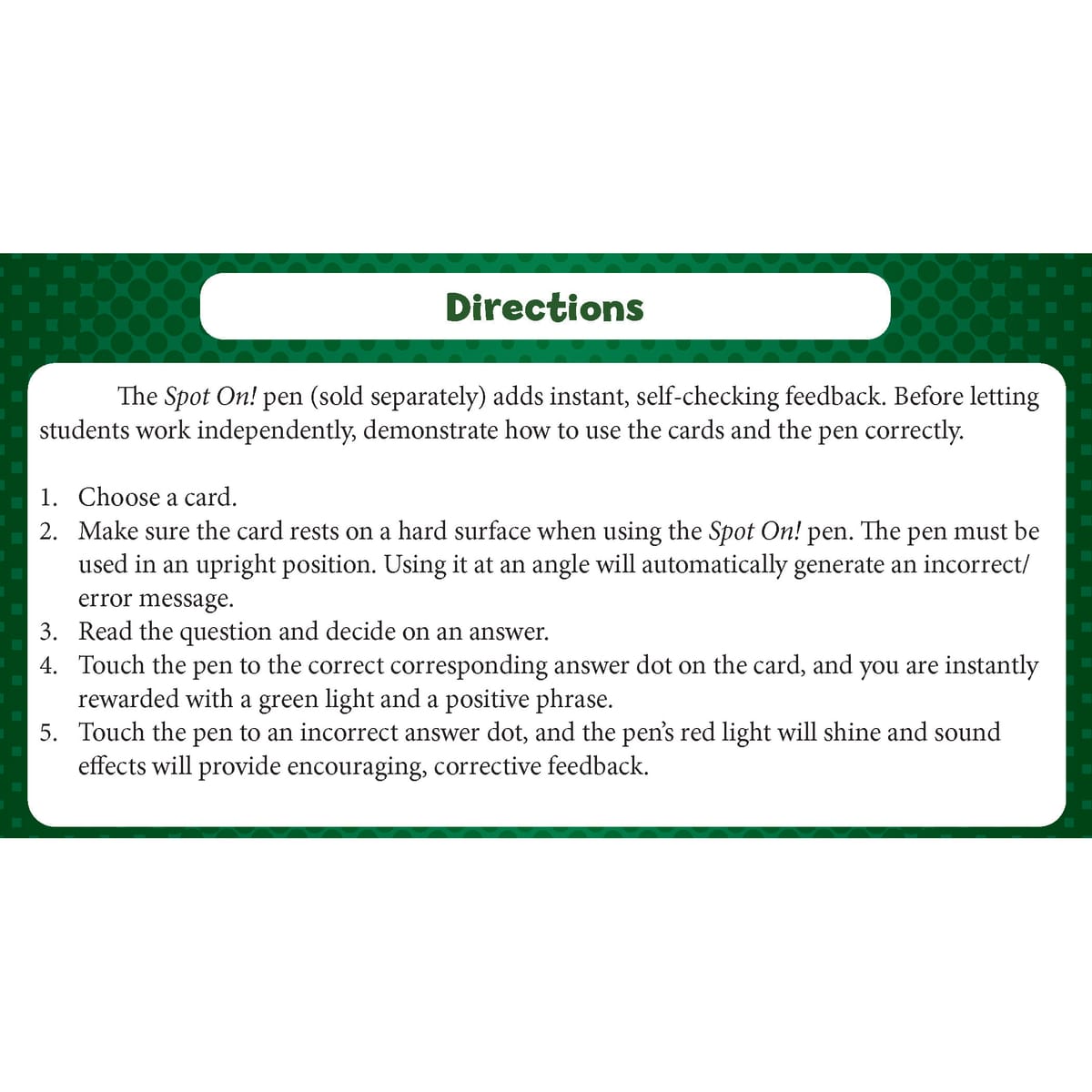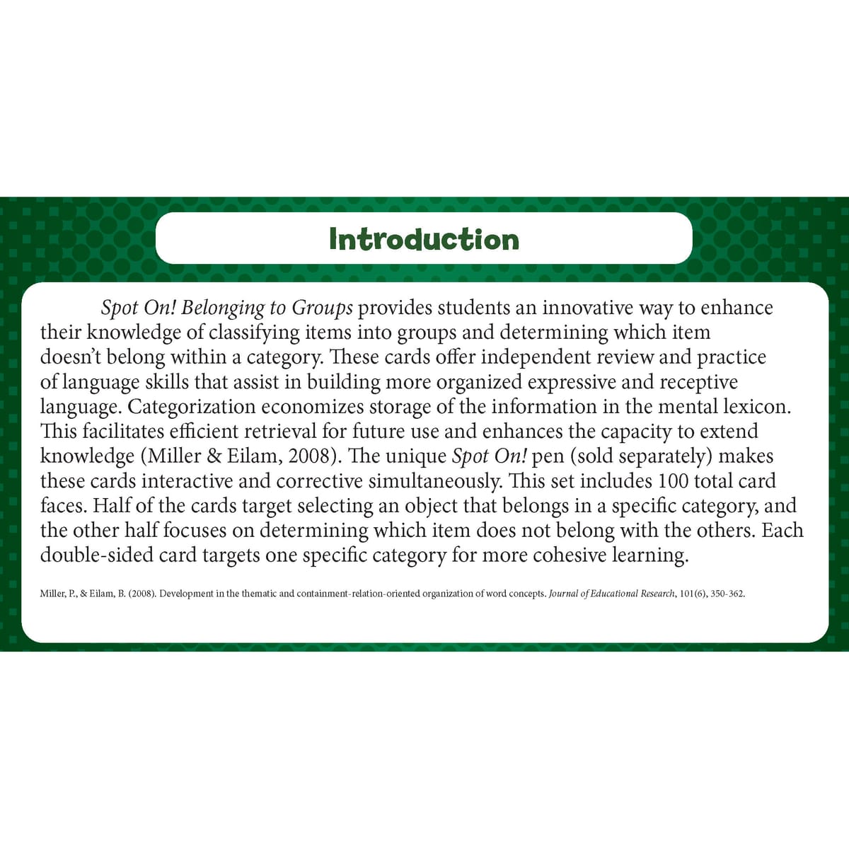 The Spot On! Pen (sold separately) transforms basic grouping exercises into an engaging, self-correcting game. Whether a student is identifying what belongs or spotting the “odd one out,” the immediate feedback helps them internalize the “why” behind each group. The large card format and photo-based answers ensure that even the youngest learners can participate with confidence.