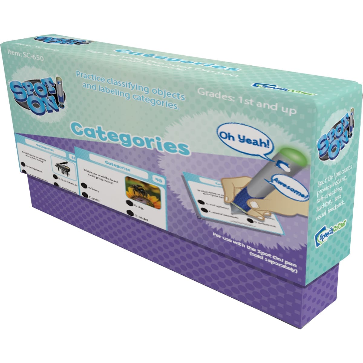 Using the Spot On! Pen (sold separately), students engage in an interactive learning experience that provides immediate validation. Whether they are identifying a group name or selecting a matching item, the instant green light and positive audio feedback keep motivation high and turn therapy into a rewarding “mystery-solving” session.