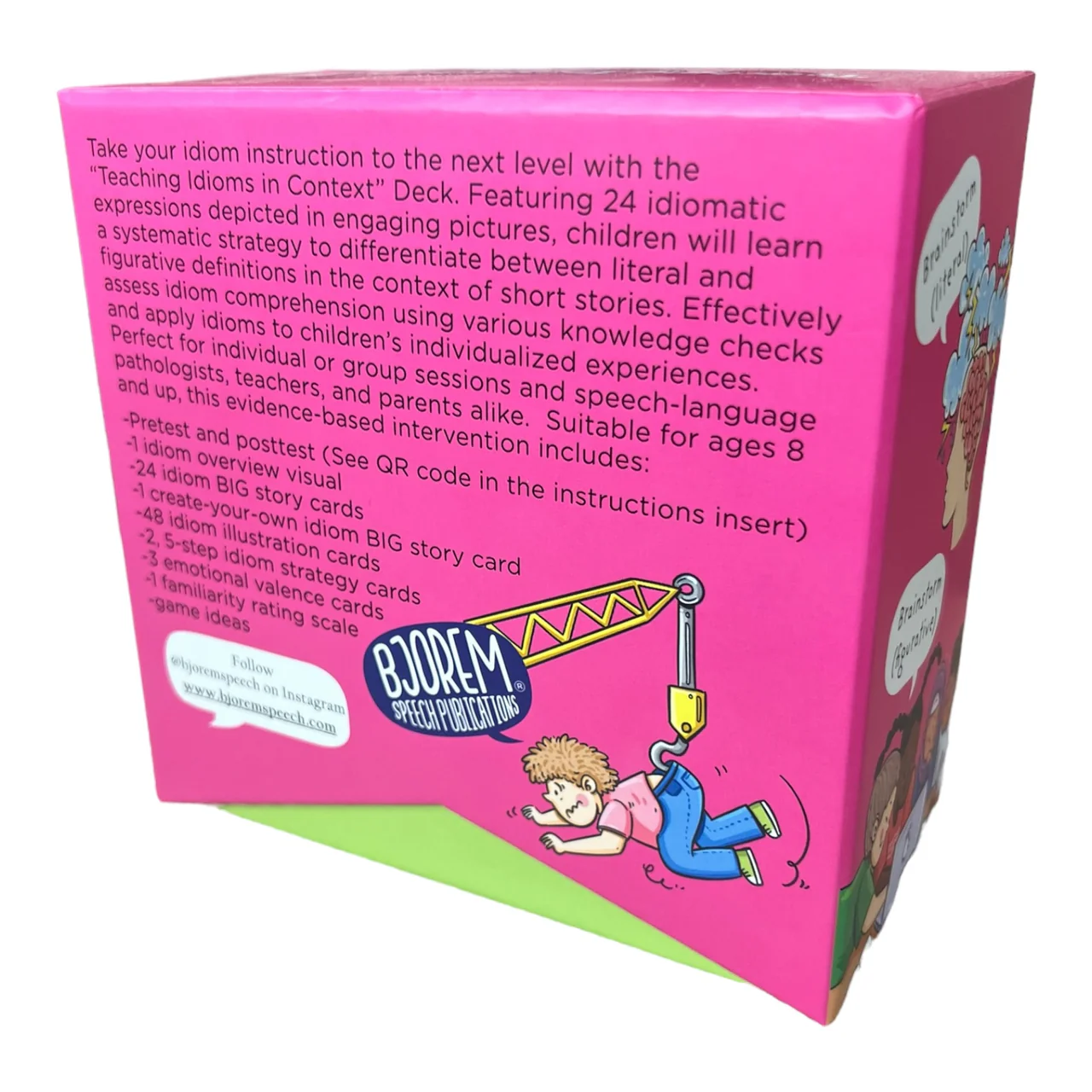 The Bjorem Speech® Teaching Idioms in Context Deck is an innovative tool designed to enhance the understanding of idiomatic expressions, which are pivotal for both academic and social success. Mastering idioms is crucial for effective communication and literacy, as these phrases are used frequently in both spoken and written language.