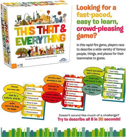Bring energy and laughter to your next game night with This That & Everything! This fast-paced, easy-to-learn game is a crowd-pleaser where players race against the clock to describe a wide variety of famous people, everyday things, and well-known places for their teammates to guess—in just 30 seconds!